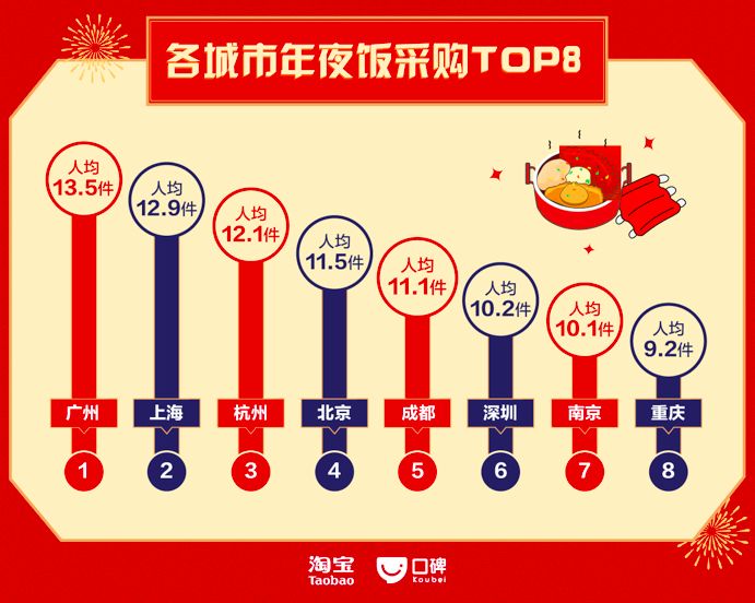 哪里人最爱为年夜饭操心?以吃为乐的广州人表示:我们绝不能服输。淘宝数据显示,这个腊月里,广州人平均下单15.3件年货,雄踞全国第一。而上海人、杭州人也以12.9件、12.1件紧随其后,而成都人则成功跻身前五之列。