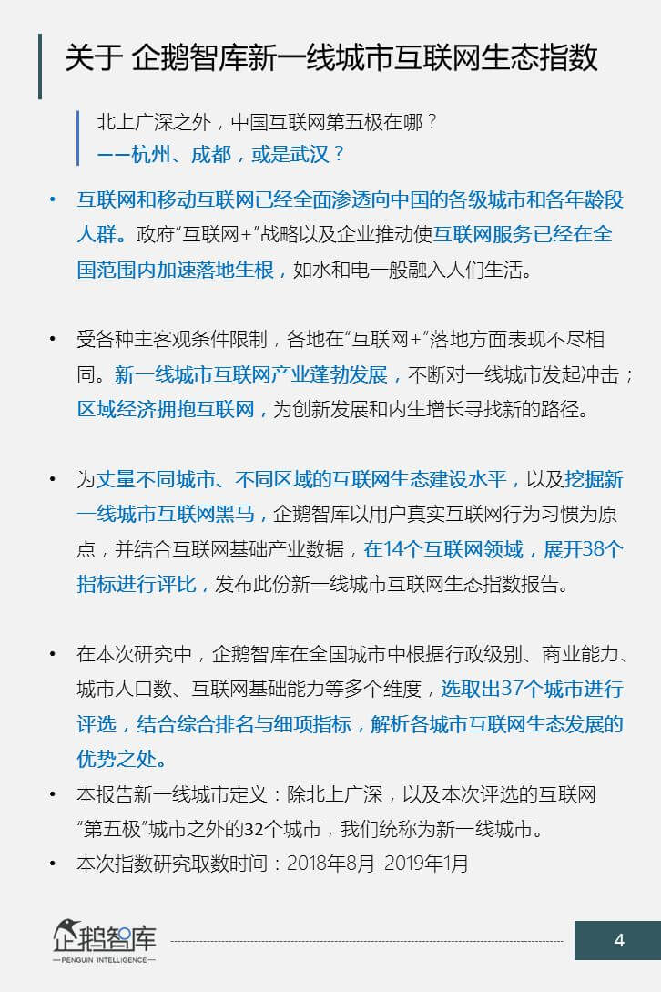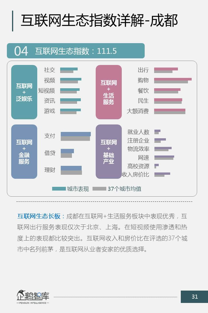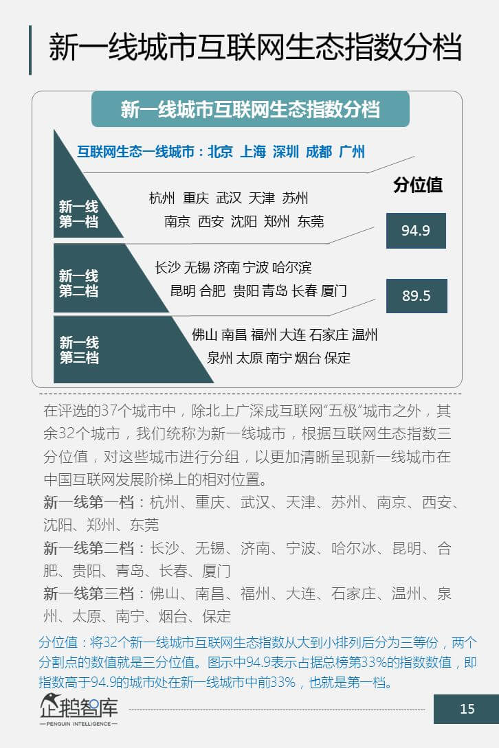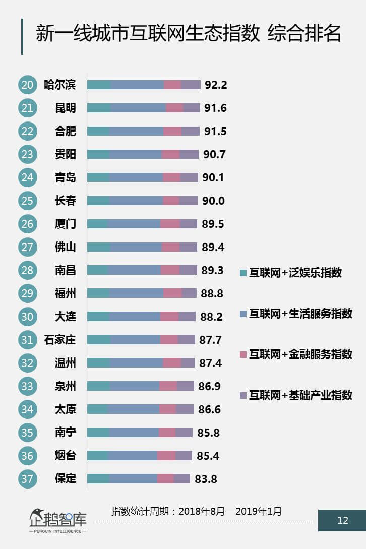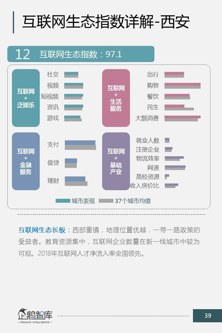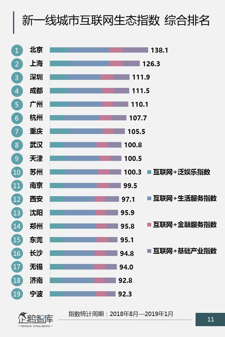 为丈量不同城市、不同区域的互联网生态发展水平,以及挖掘新一线城市互联网黑马,企鹅智库(id:BizNext)在全国城市中根据行政级别、商业能力、城市人口数、互联网基础能力等多个维度,选取出37个城市进行评选,以用户真实互联网行为习惯为原点,并结合互联网基础产业数据,在14个互联网生态领域,选取38个指标维度进行综合评估,结合综合排名与细项指标,去寻找各城市互联网生态发展的优势之处。