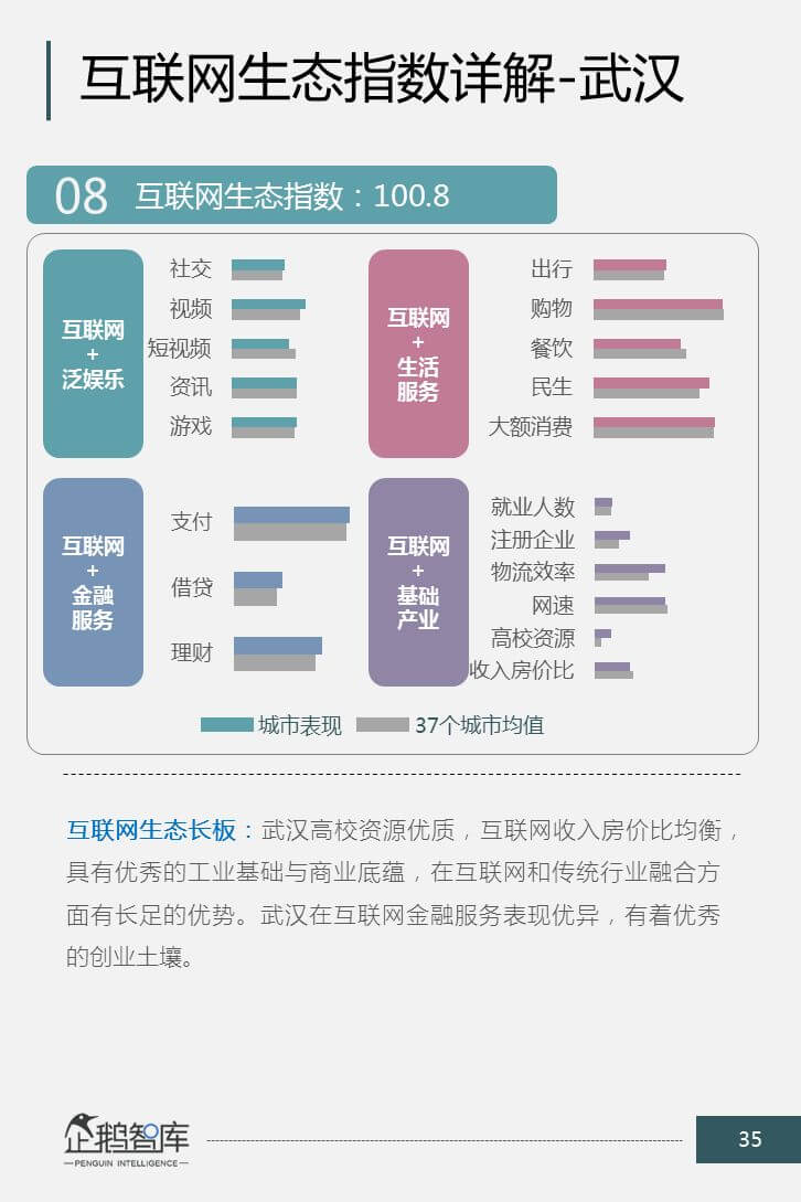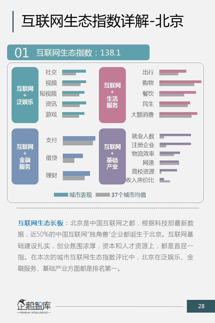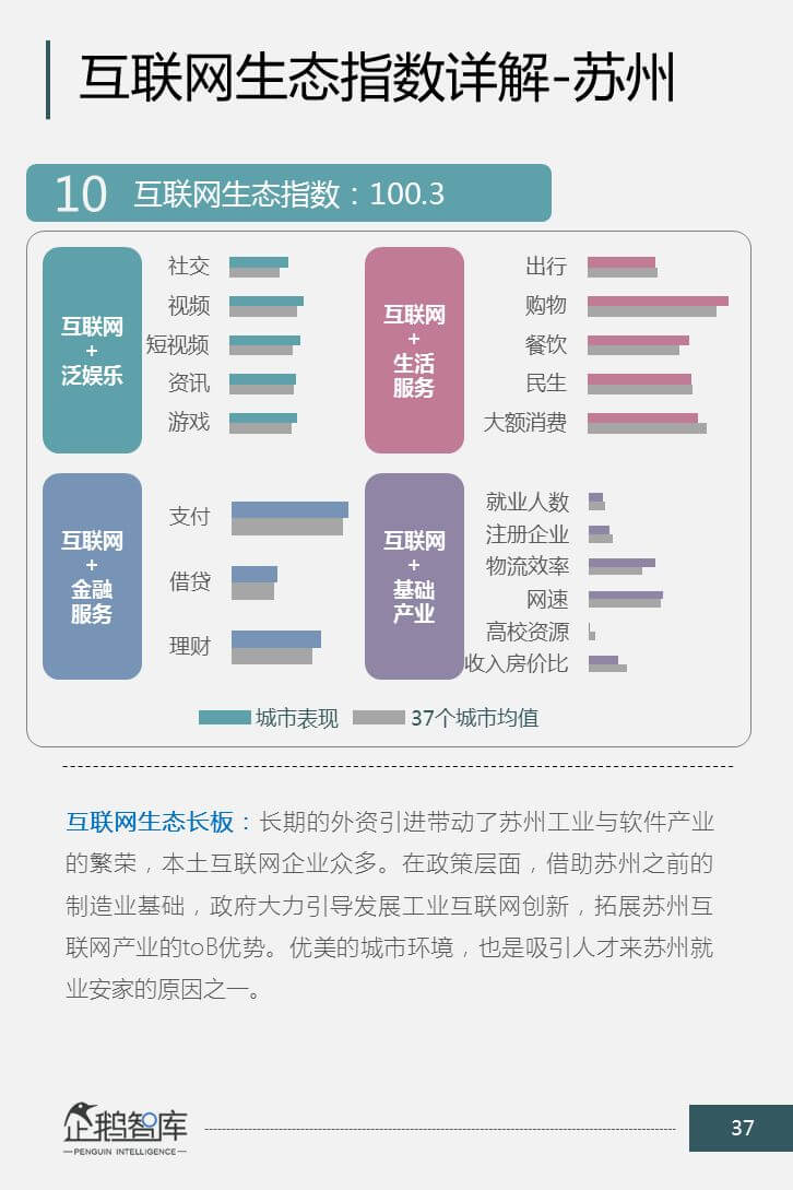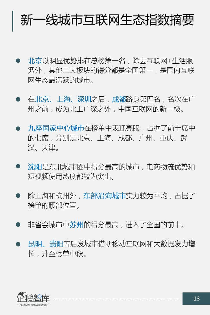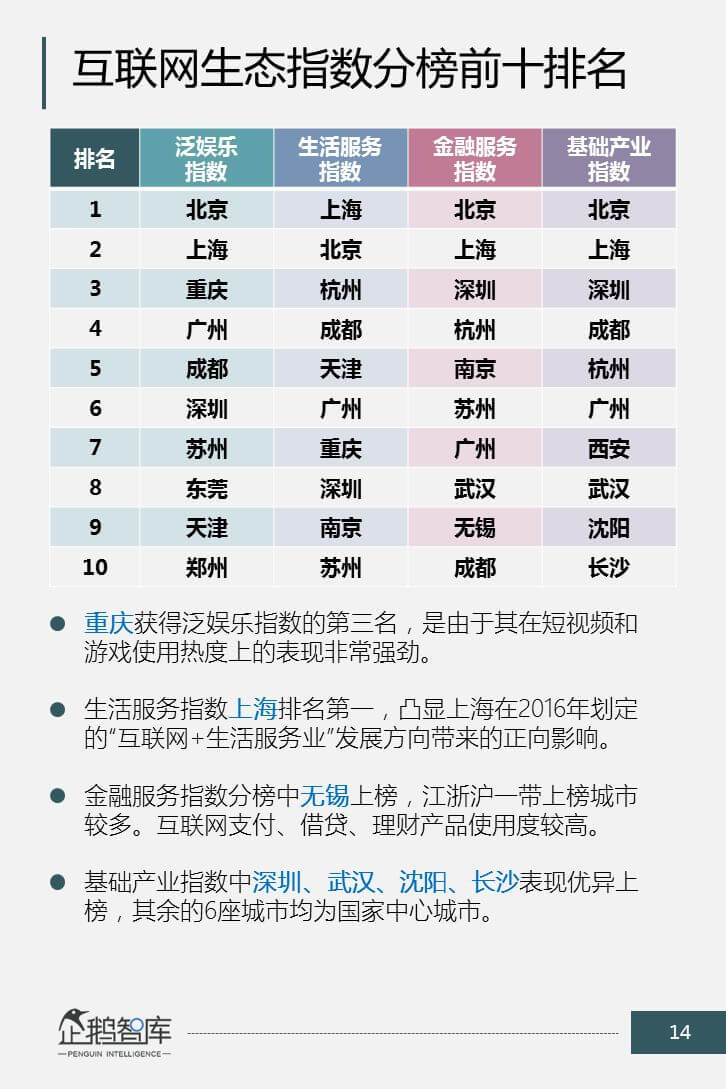 为丈量不同城市、不同区域的互联网生态发展水平,以及挖掘新一线城市互联网黑马,企鹅智库(id:BizNext)在全国城市中根据行政级别、商业能力、城市人口数、互联网基础能力等多个维度,选取出37个城市进行评选,以用户真实互联网行为习惯为原点,并结合互联网基础产业数据,在14个互联网生态领域,选取38个指标维度进行综合评估,结合综合排名与细项指标,去寻找各城市互联网生态发展的优势之处。