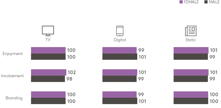 问及两性对广告的看法时,如享受、参与或品牌塑造,总体并没有太大差异。