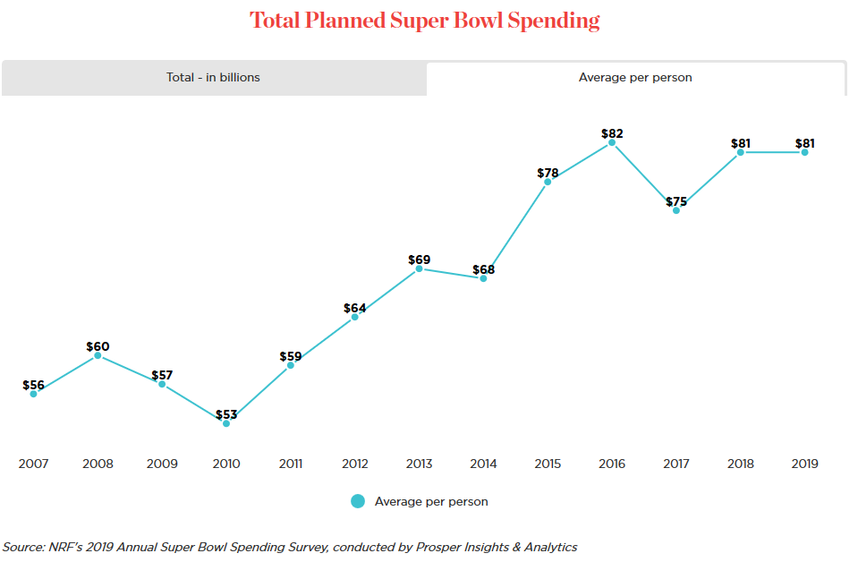 根据全国零售联合会和Prosper发布的年度调查,美国成年人今年将为“超级碗”平均花费81.30美元,共计148亿美元。