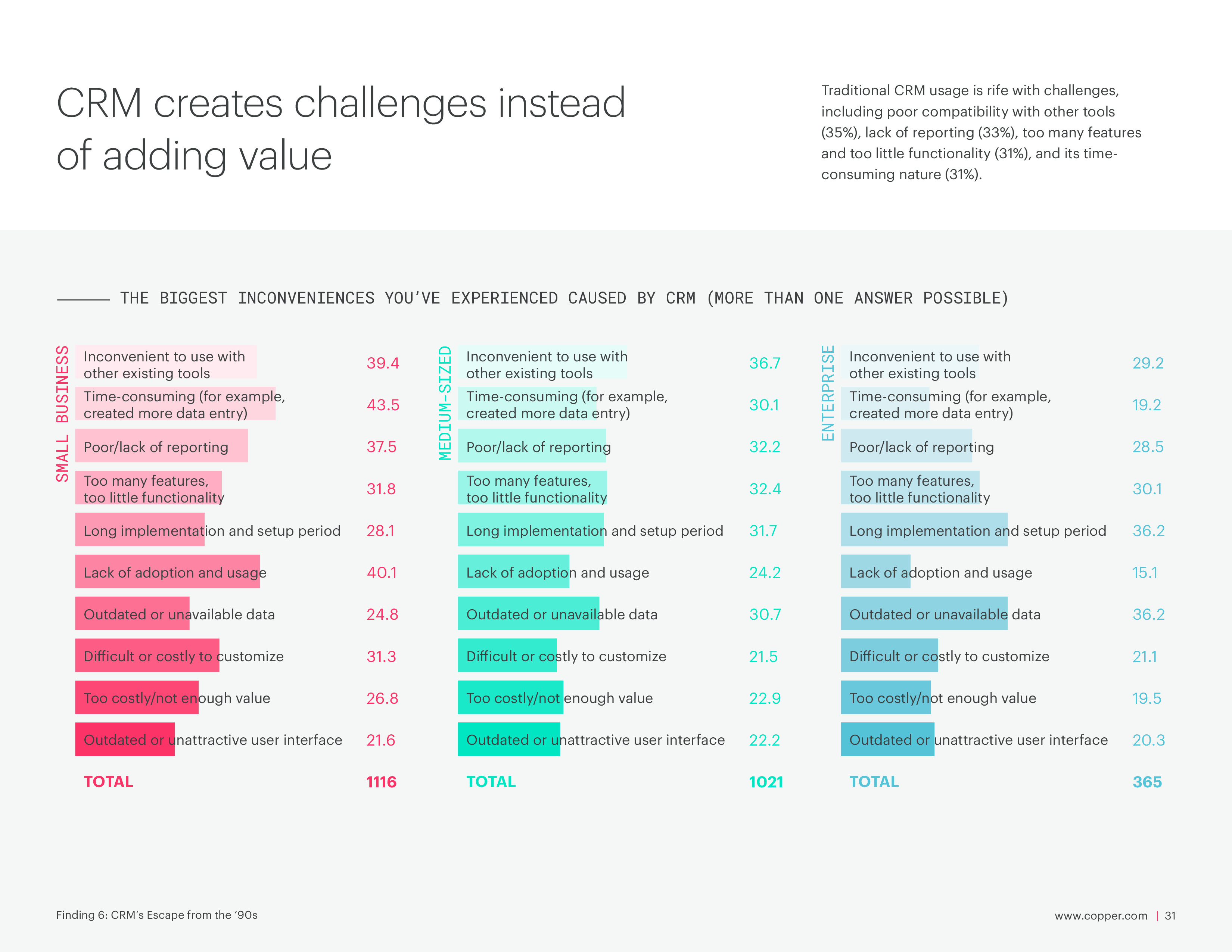 采用这种具有规模的办法可能会导致企业之间出现更多的问题。1/4的大企业受访者在面对与CMR相关的问题时感到尴尬,相比之下,只有14%的小企业面临相似的问题。即便如此,CRM相关的问题给企业带来各种各样的烦恼,无论公司的规模大小,1/3的专业人士承认他们对队友感到不安或恼火。