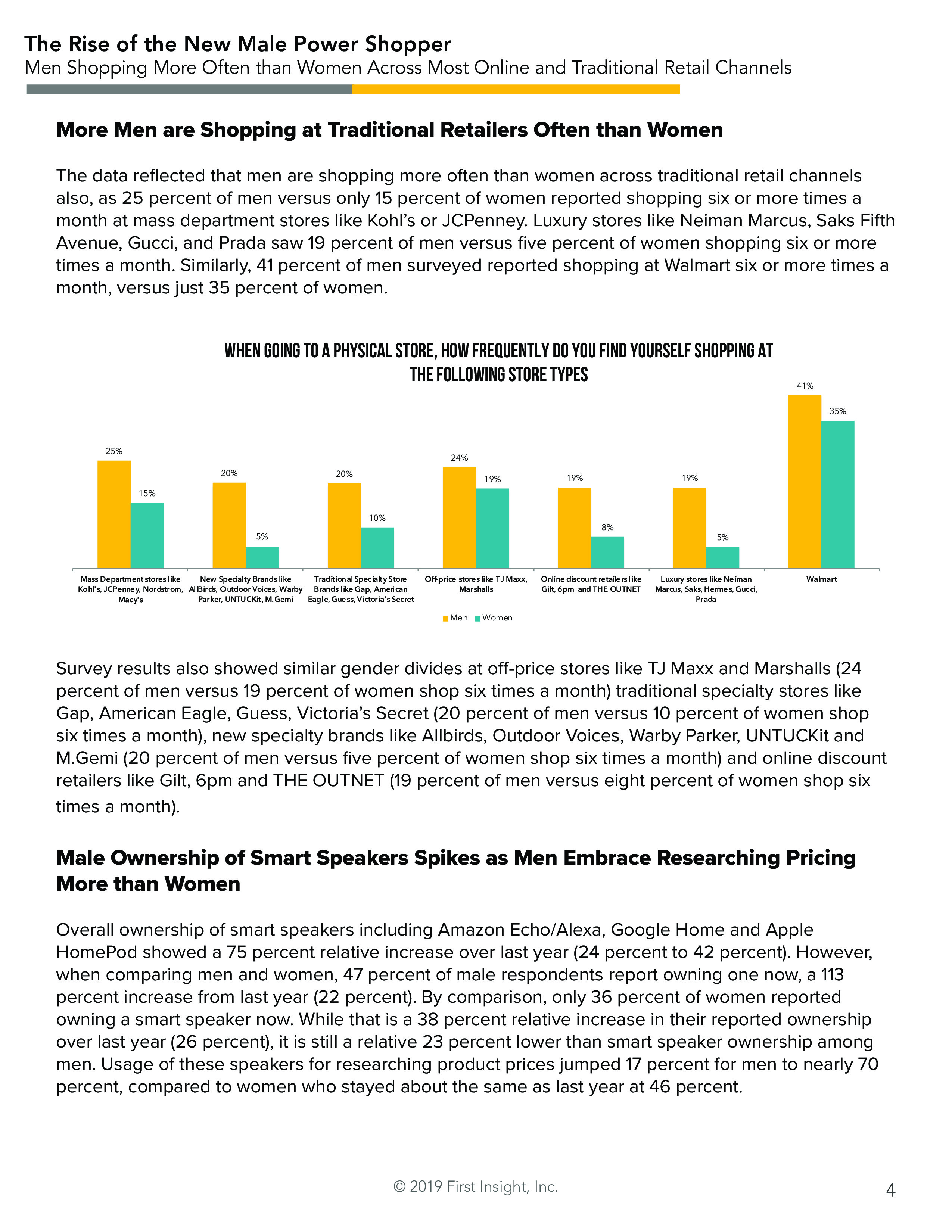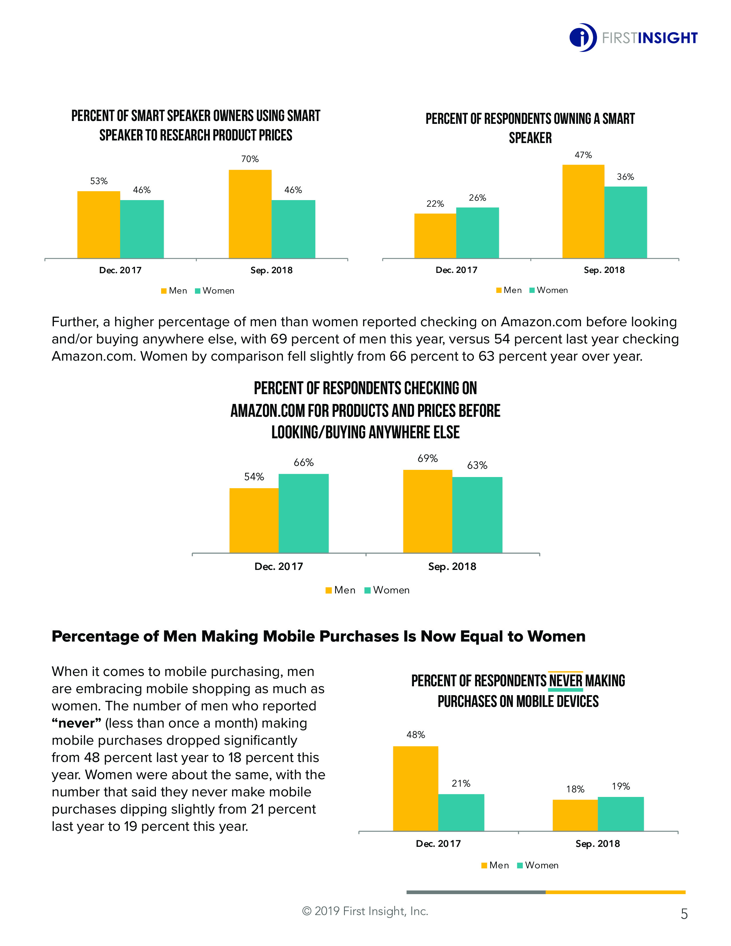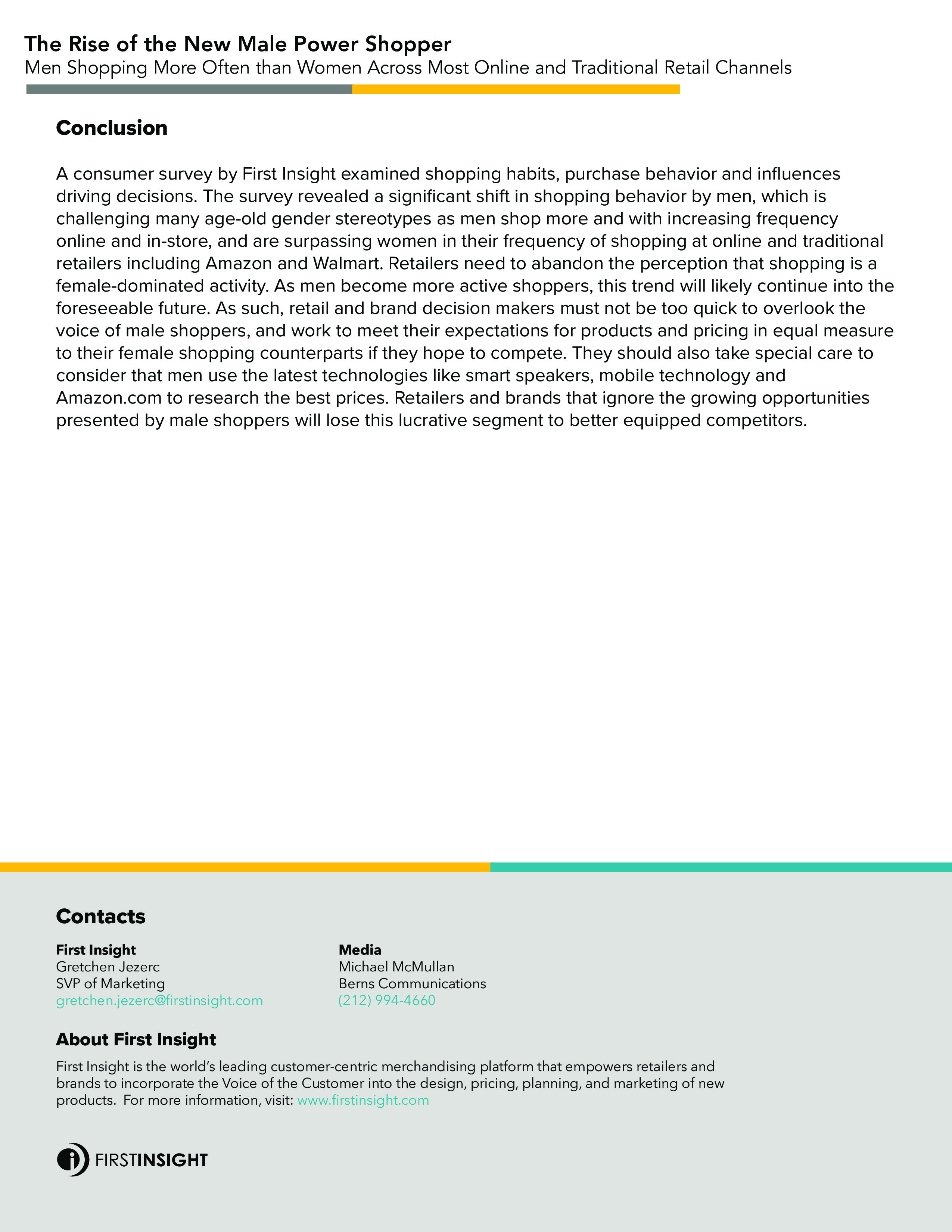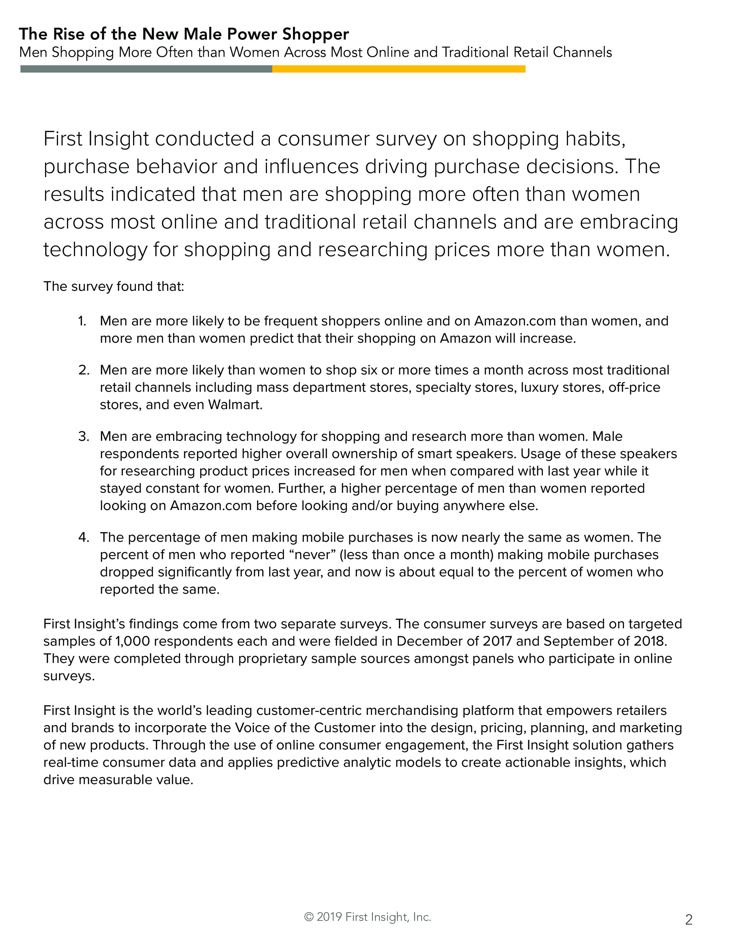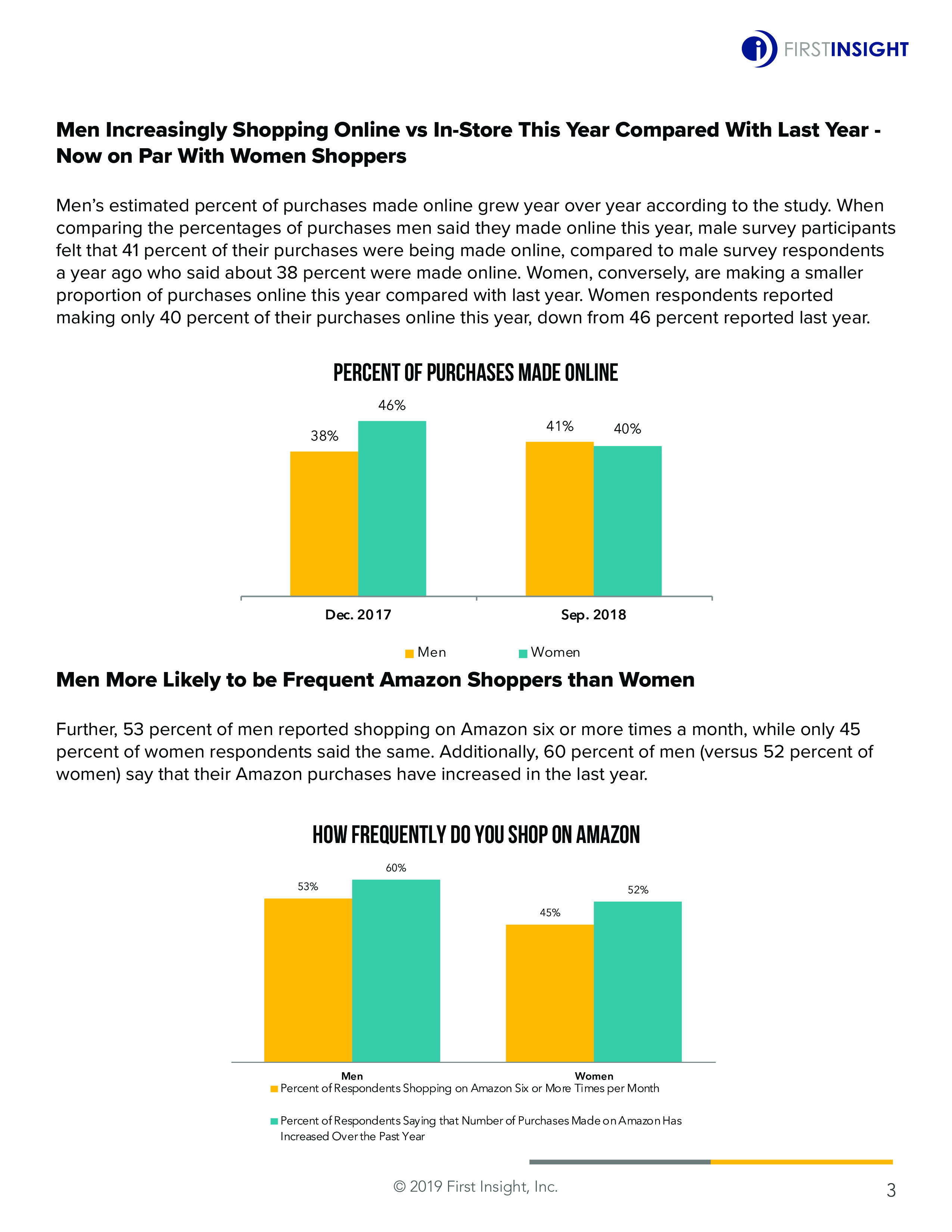 First Insight发布了新报告“男性消费者的崛起”。男性正在网上购买商品,与女性几乎持平。报告基于2017年12月和2018年9月进行的对1000名受访者的两次调查。