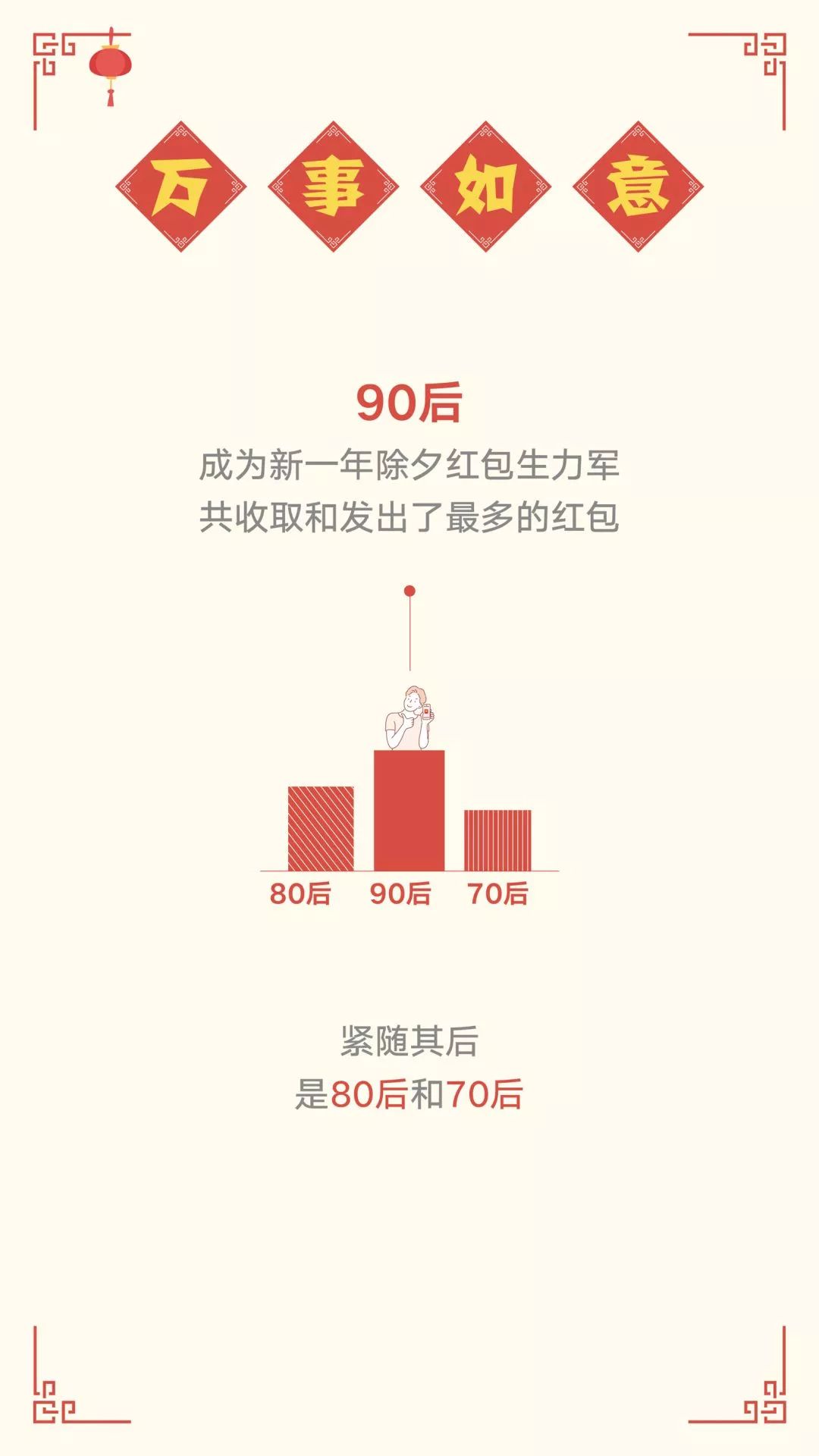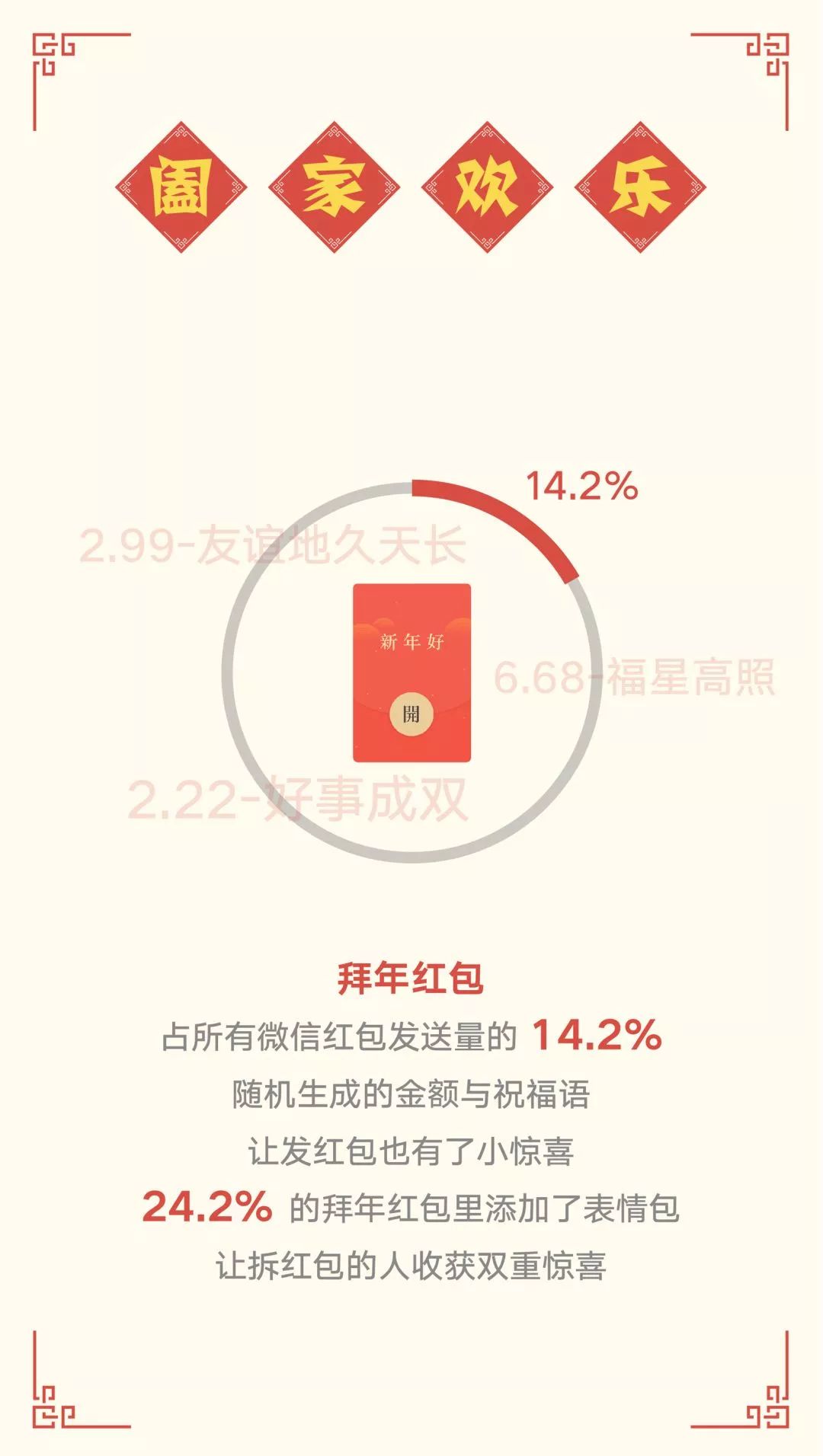 2019春节微信除夕数据报告 除夕过了,总结了一些数据,关键词有三个:心意、祝福、微信红包。 以下为报告全文,我们致力让心意更好地传达。 更多阅读:联通:2019年春节大数据报告工信部:2024年春节9天全国消耗674.5万TB流量 抖音App占比第一CTR:2016春节营销观察春节档电影总票房超过80亿 刷新多项世界纪录春节境外消费回流 天猫国际成交同比大增 60%腾讯:中国网民的春节网络消费力报告腾讯:2015年春节网民用智能手机发送祝福比例超50%2019春节微信数据报告:8.23亿人收发红包淘宝:2019年夜饭大赏泽平宏观:2019中国生育报告贝壳大数据:2019理想三居报告2019中国餐饮报告新氧:2019医美行业白皮书2019春节红包报告:几个数据带你回顾薅红包大混战2019职场单身人才:巨蟹座单身占比最高,60.4%职场人渴望脱单