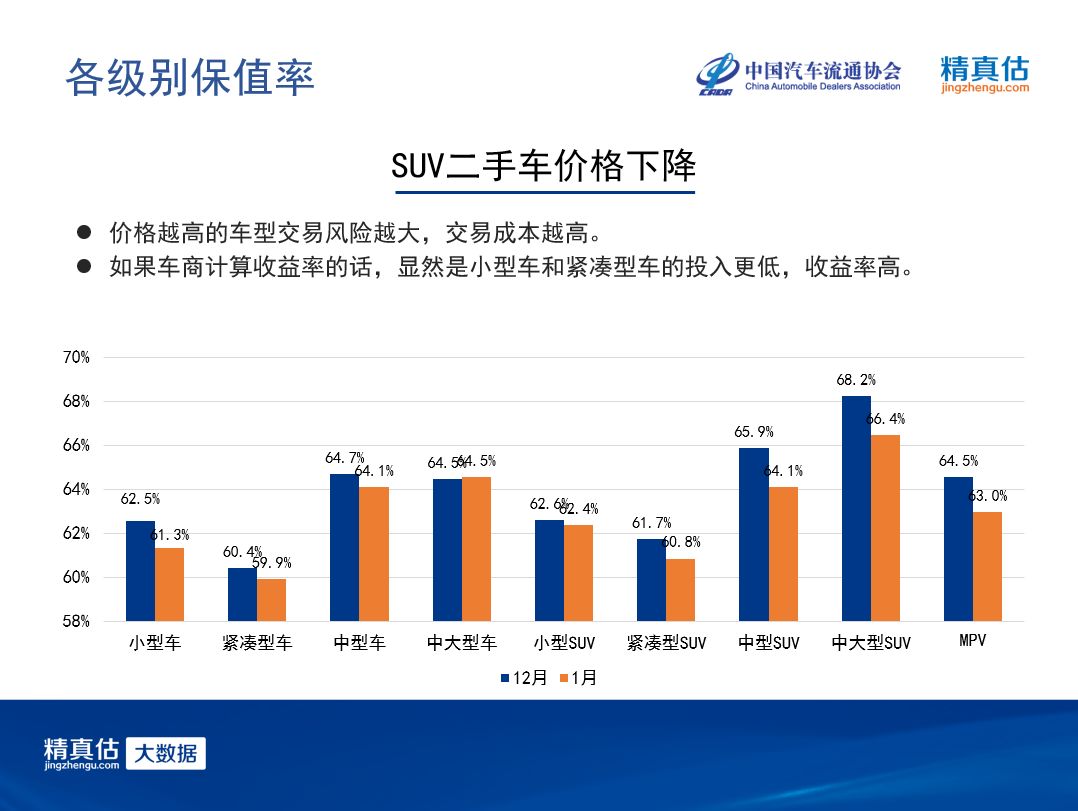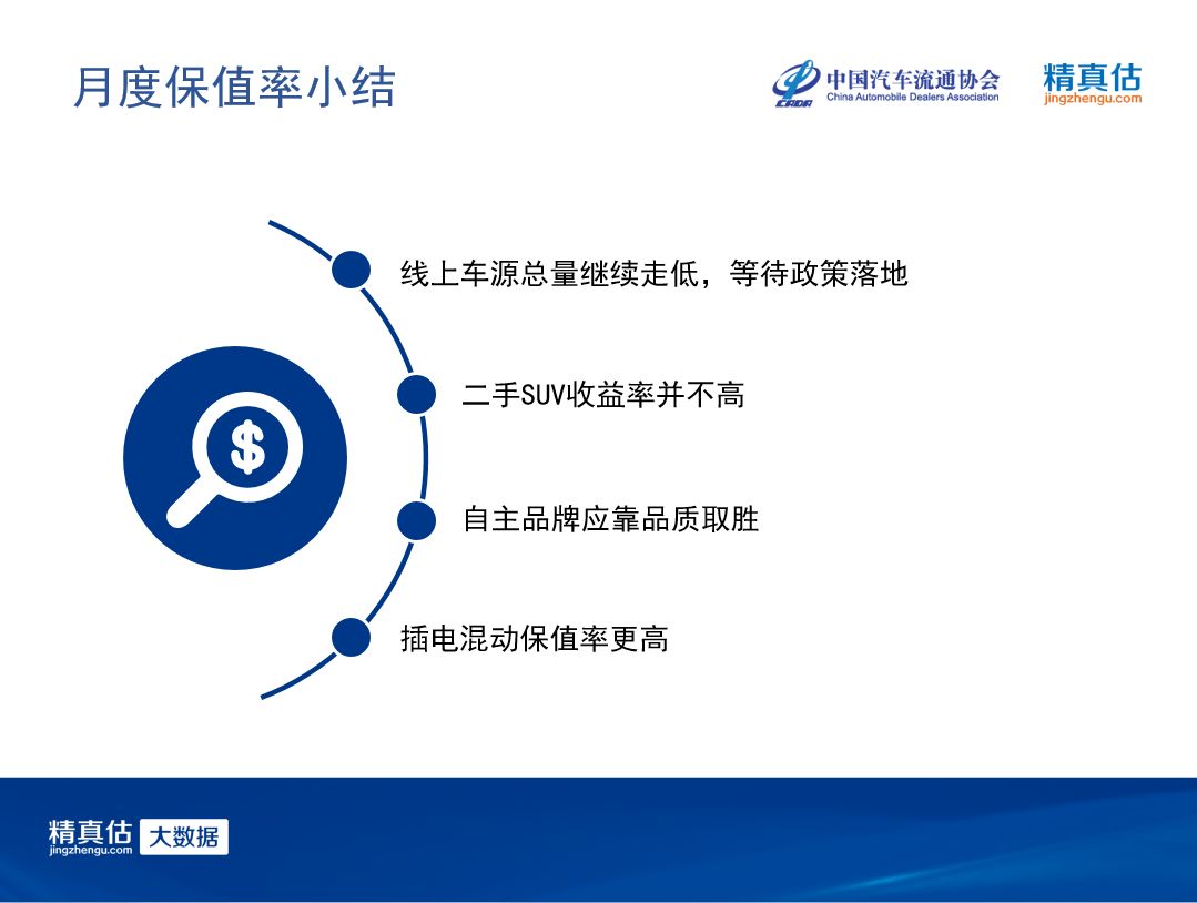 最后为大家总结2019年1月的保值率报告:年初车源量低,集体都在等政策;二手的SUV成本太高,收益率不高;自主品牌靠品质也可以取得不错的保值率;新能源车中,插电混动车型的保值率尚可。