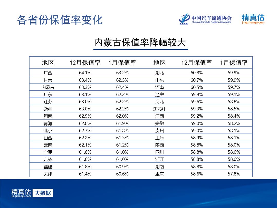 细分市场可以按照地区来分,但是这个月几乎所有地区的保值率都下降,这是季节特征。尤其是北方地区,比如内蒙古保值率降幅较大,也就是二手车价格下降比较大。传统燃油车3年保值率基本在60%左右,这里是B2C零售价格。