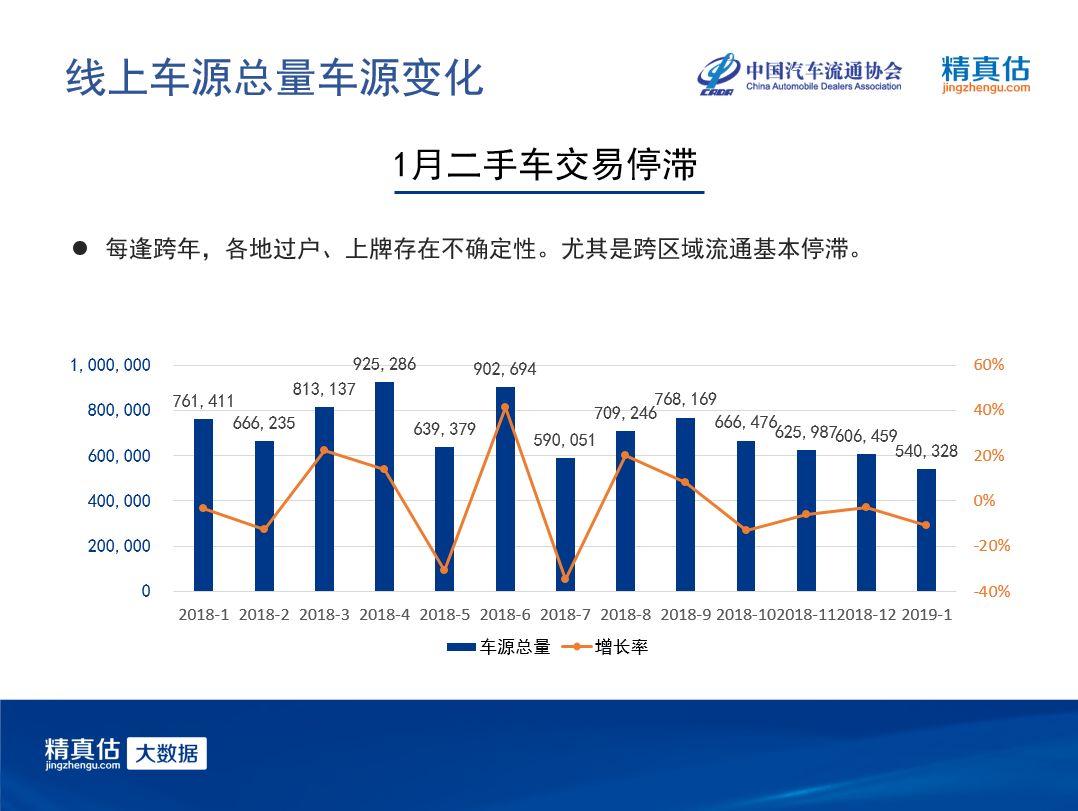在车源方面,2019年1月车源环比上个月下降10.9%,主因是季节因素,跨年时全国各地的上牌、过户政策都有一些不确定性,尤其是跨省交易。此外,消费降级导致置换车减少,电商平台近期业务收缩,这些也都是影响车源的原因。