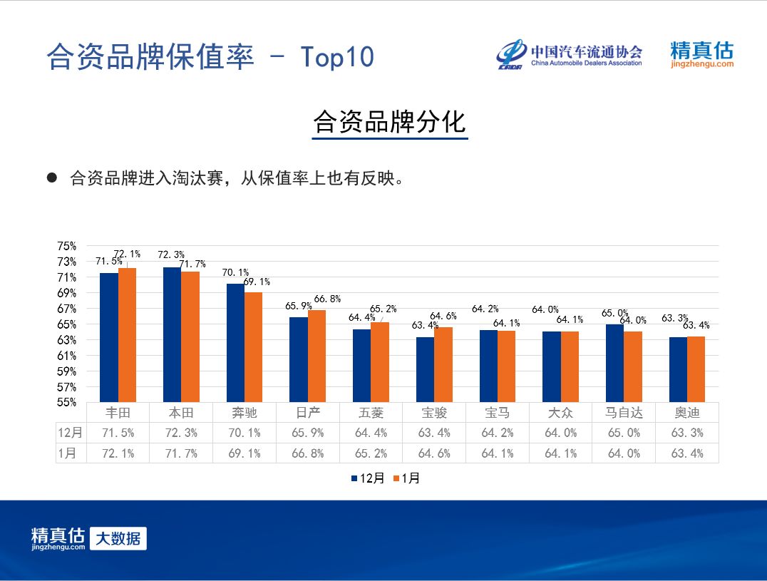 再来看各个品牌的保值率,首先是合资品牌的前十名。这里也包括了奔驰、宝马、奥迪这些豪华品牌,这些品牌有很多车型也是在国内生产的,而且价格一再下探之后,BBA面对的消费者已经与大众、丰田这些品牌有部分重合了。
