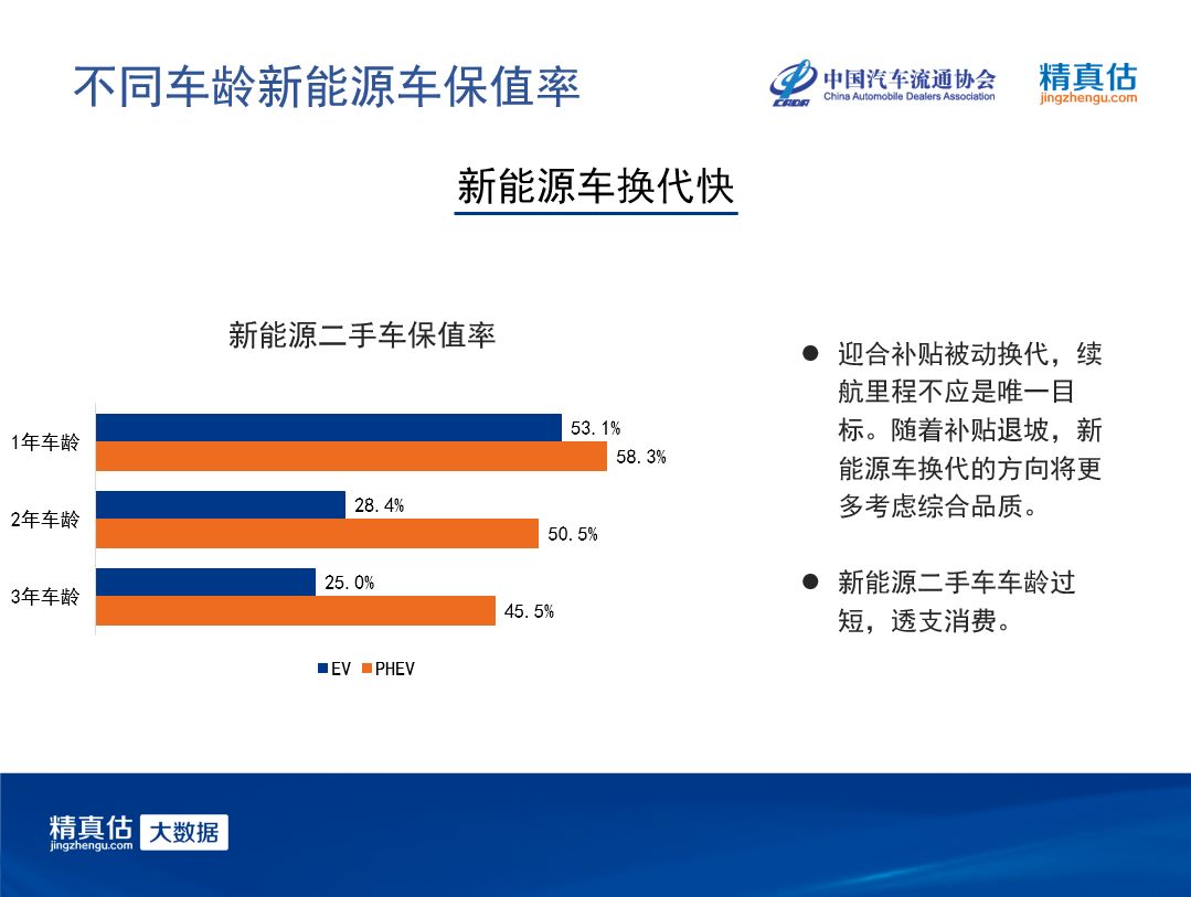 纯电动车保值率低,除了渠道因素,还有产品换代的因素。这里换代并不全是厂商主动的换代,而是被动的,只有提升续航里程才能拿到补贴。可以看到市场上一些纯电动车,换代之后驾乘品质并没有提高,甚至质量、安全性也没有提高,这对保值率也是不利的。纯电动车车龄过短,消费者其实并不需要如此频繁的换车。那么上一批电动车其实提前透支了消费。