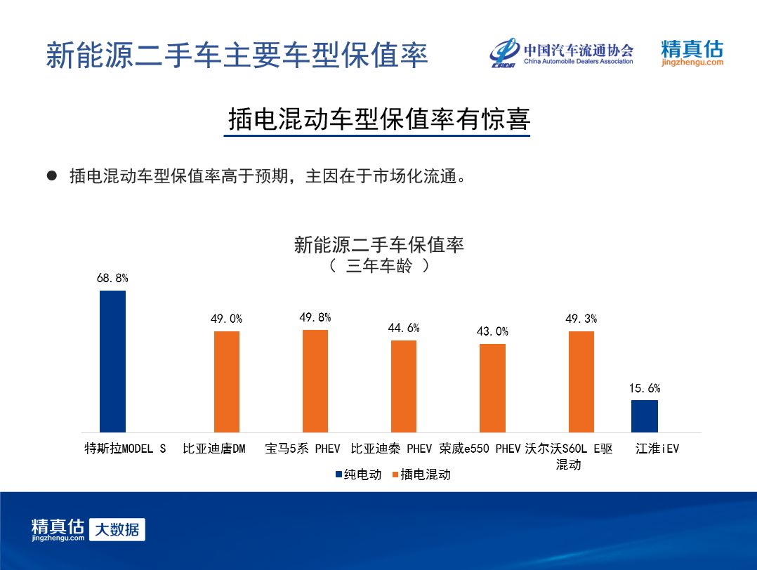 接下来看一下新能源具体车型。纯电动车包括保值率最高的特斯拉,也包括保值率较低的江淮iEV系列。插电混动产品比较多,比亚迪、宝马、荣威榜上有名。插电混动车的保值率应该说是高于预期的,原因就是市场化流通。