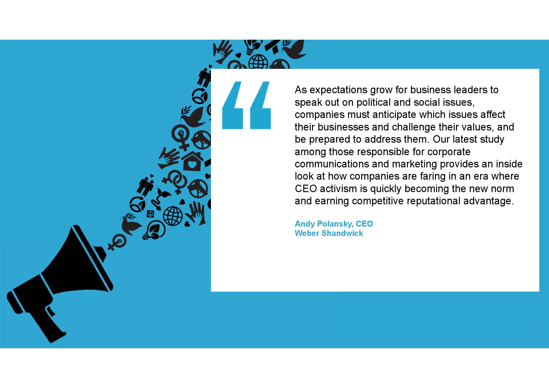 万博宣伟全球首席执行官Andy Polansky表示,“社会越来越期望企业领导者能就社会热点问题发表见解,企业也应未雨绸缪,做好相应的准备。最近,我们针对传播和营销高管人士开展了一项调研,进一步深入了解公司在CEO行动力迅速发展的背景下,将采取怎样的应对措施。全球许多企业认识到CEO行动力越演越烈,如果公司没有提前做好相应的准备,将难以为继。”