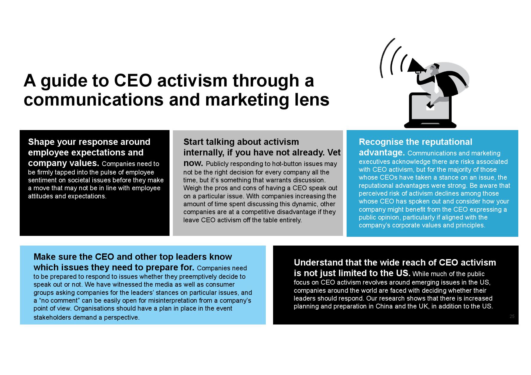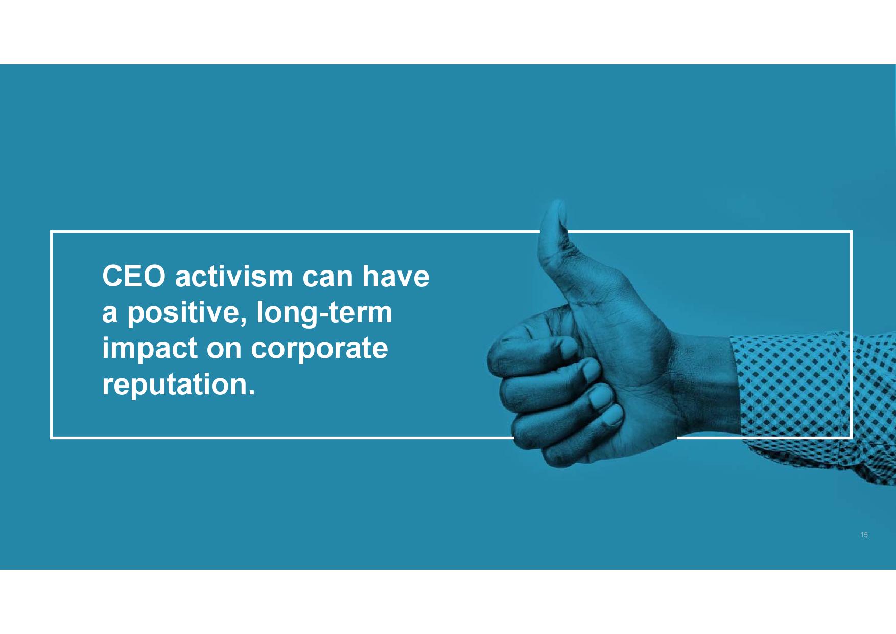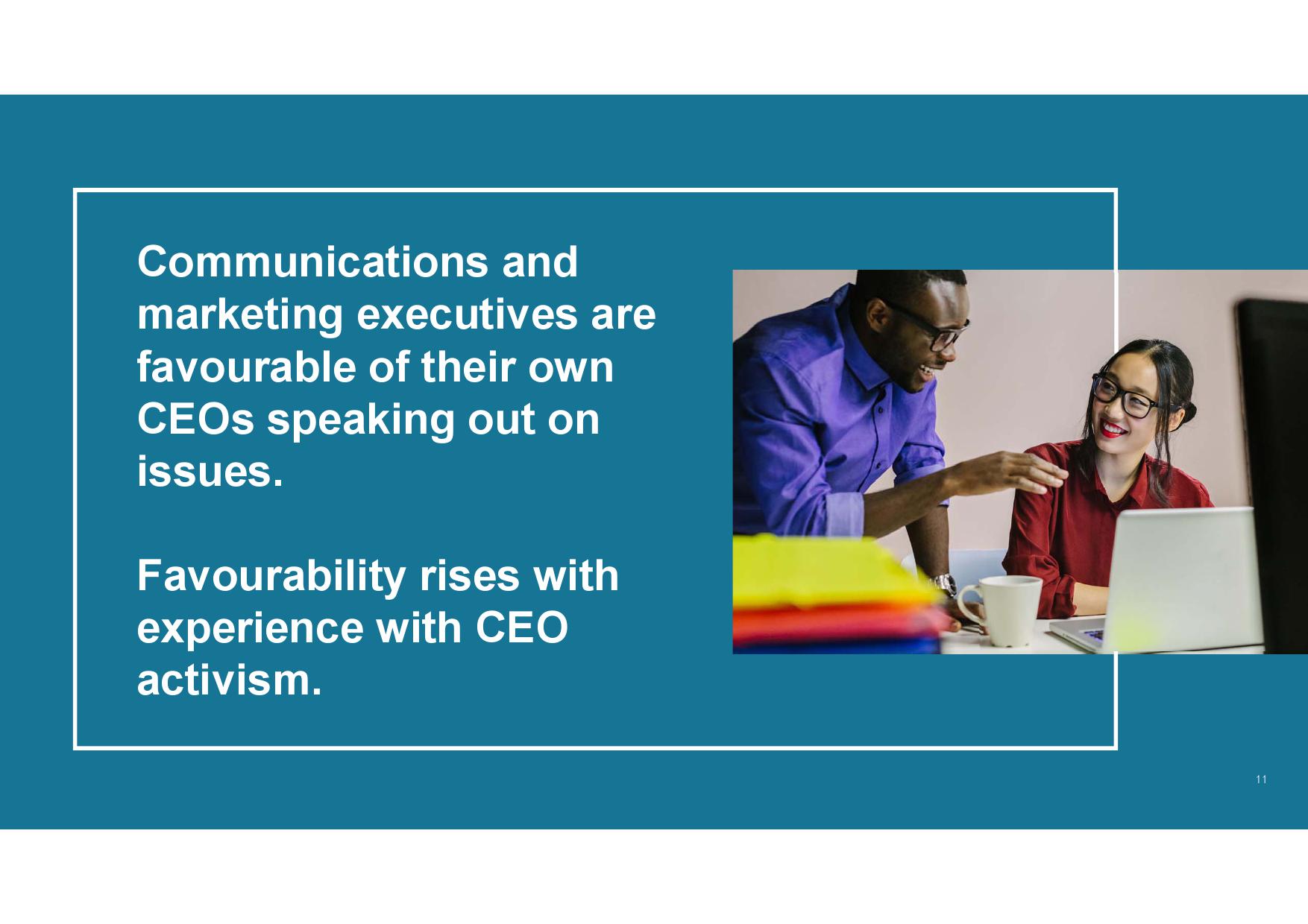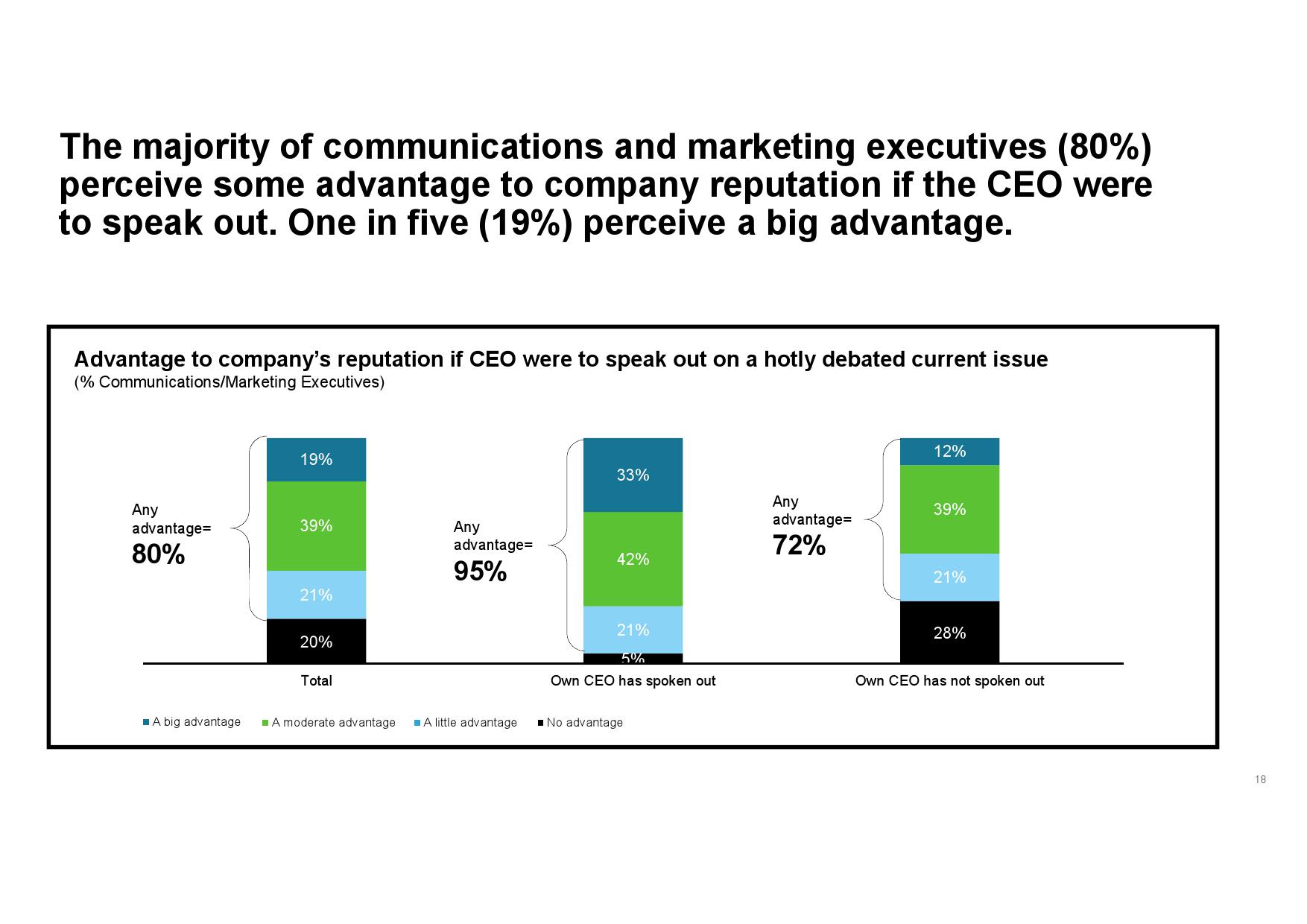 - 认识企业声誉优势。虽然传播和营销高管承认CEO行动力存在一定风险,但其为公司所产生的声誉优势更突出。此外,在CEO已经公开发声的企业中,传播和营销高管所承受的感知风险更低,同时公司也会从中受益,尤其在其与公司价值观和原则一致的情况下。