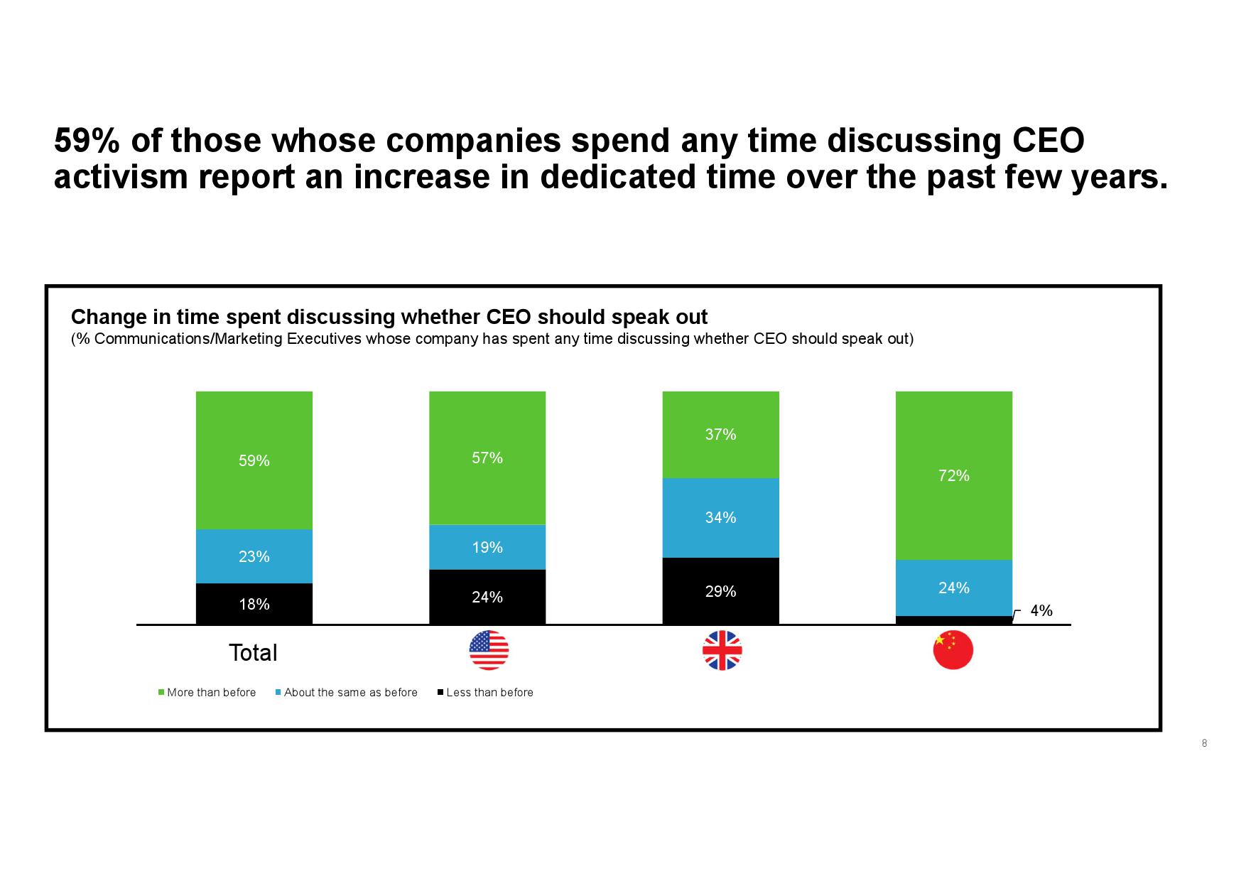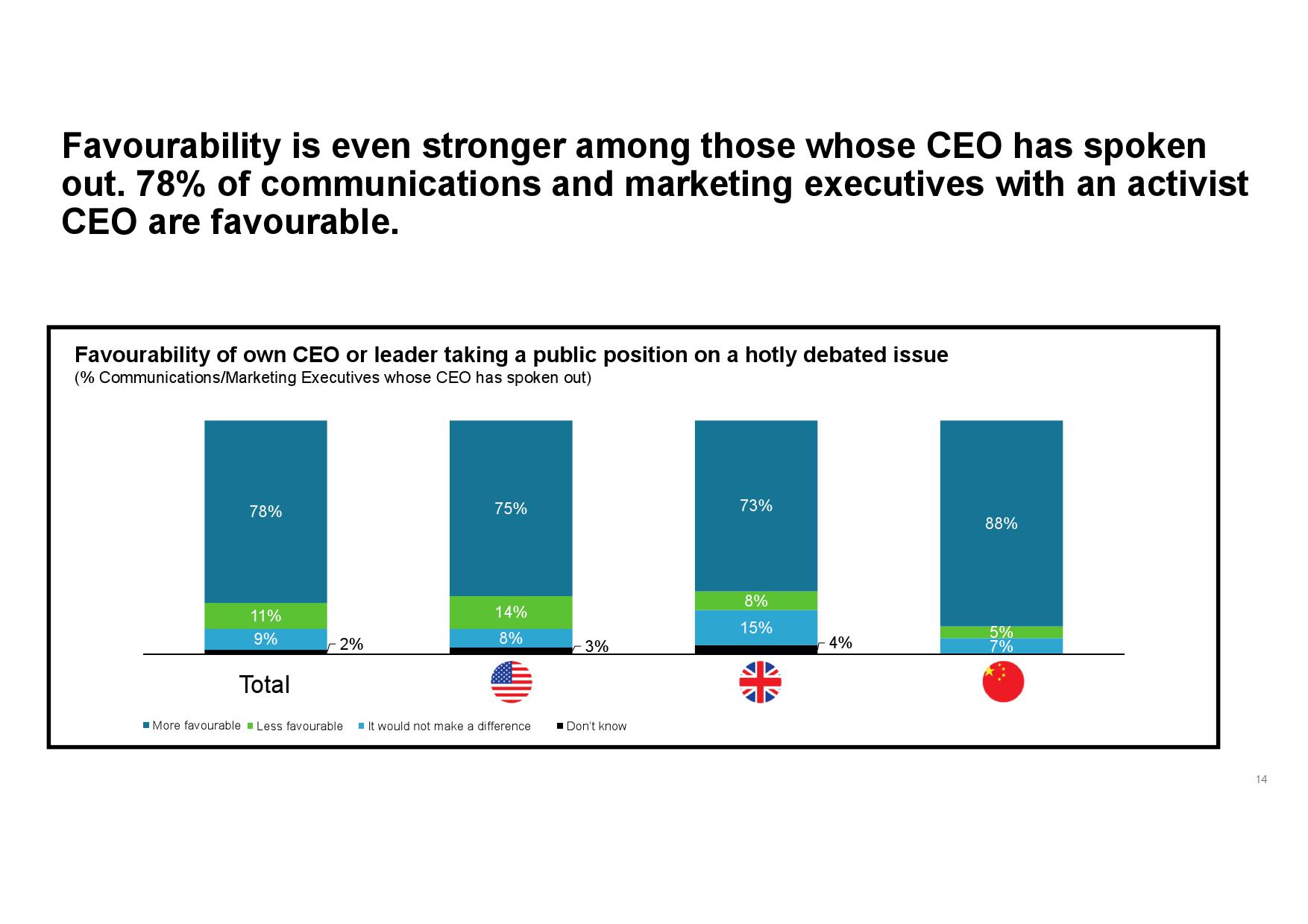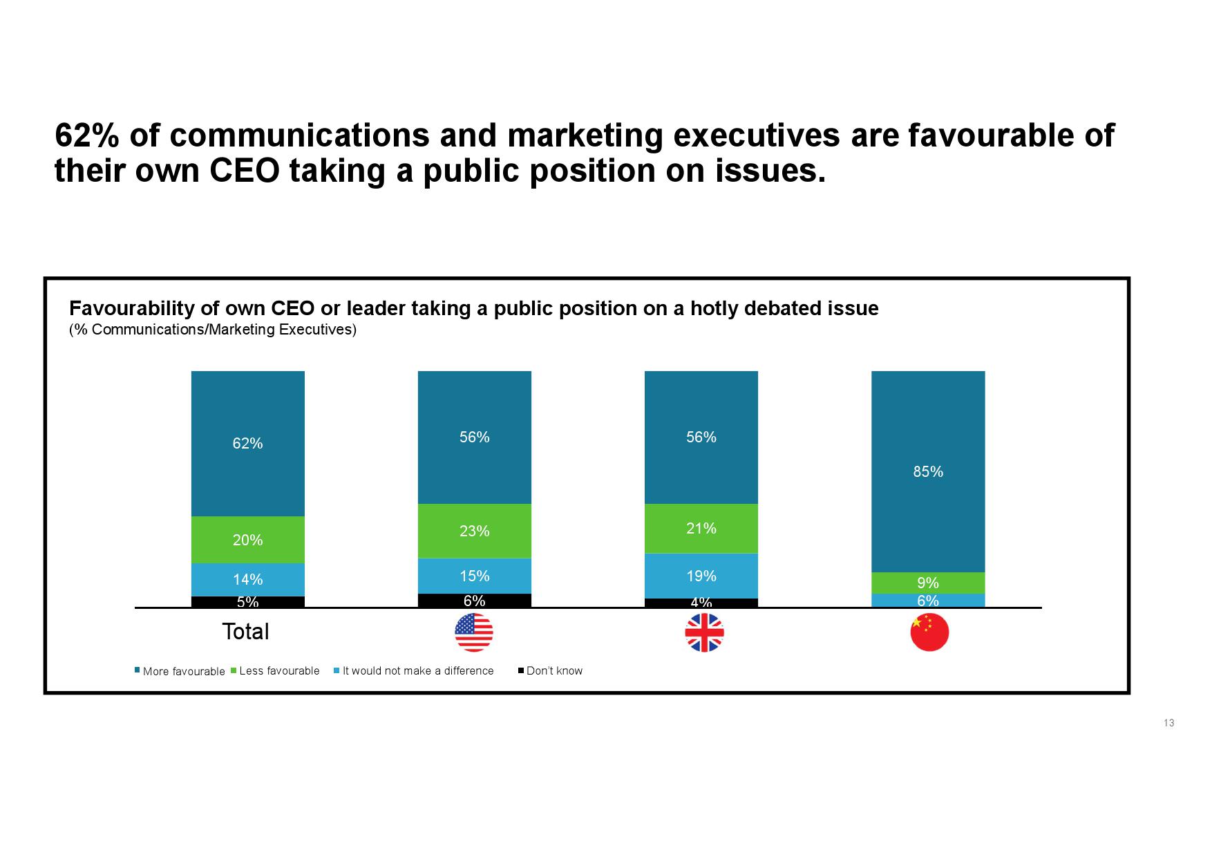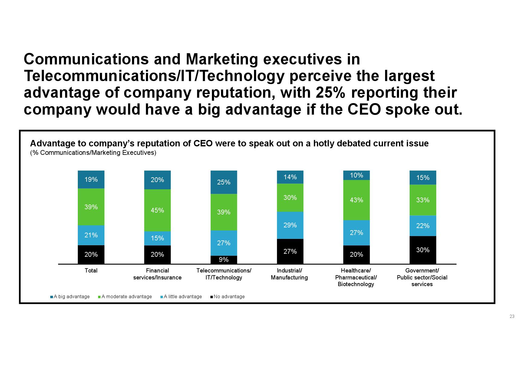 - 认识企业声誉优势。虽然传播和营销高管承认CEO行动力存在一定风险,但其为公司所产生的声誉优势更突出。此外,在CEO已经公开发声的企业中,传播和营销高管所承受的感知风险更低,同时公司也会从中受益,尤其在其与公司价值观和原则一致的情况下。
