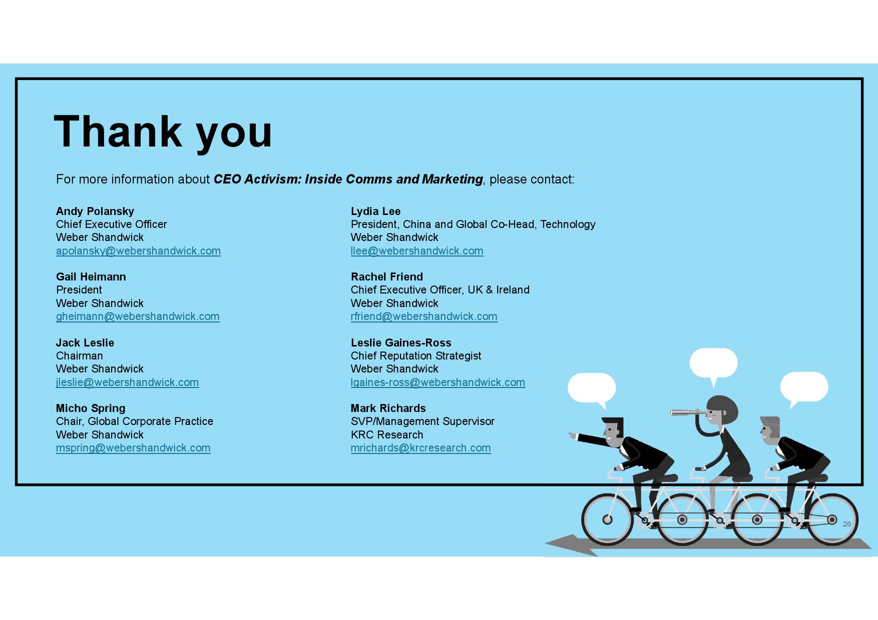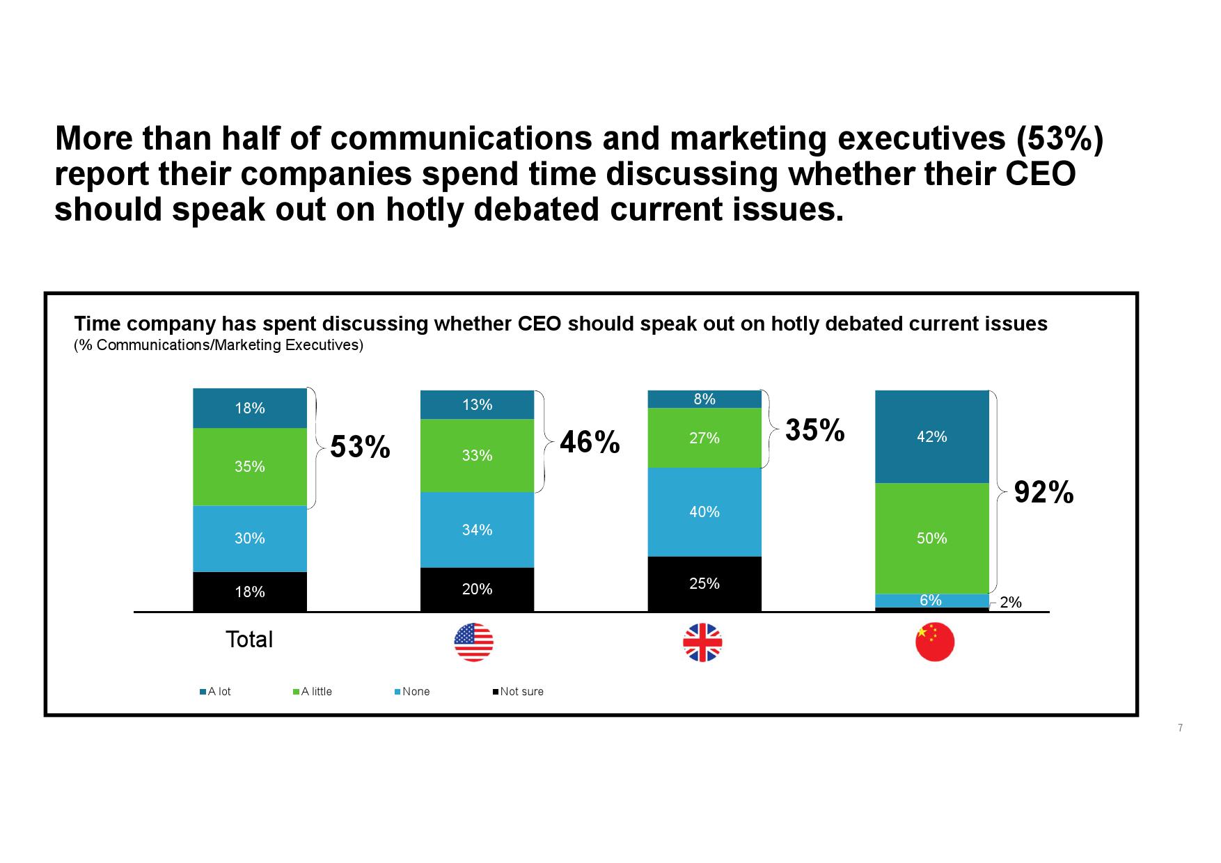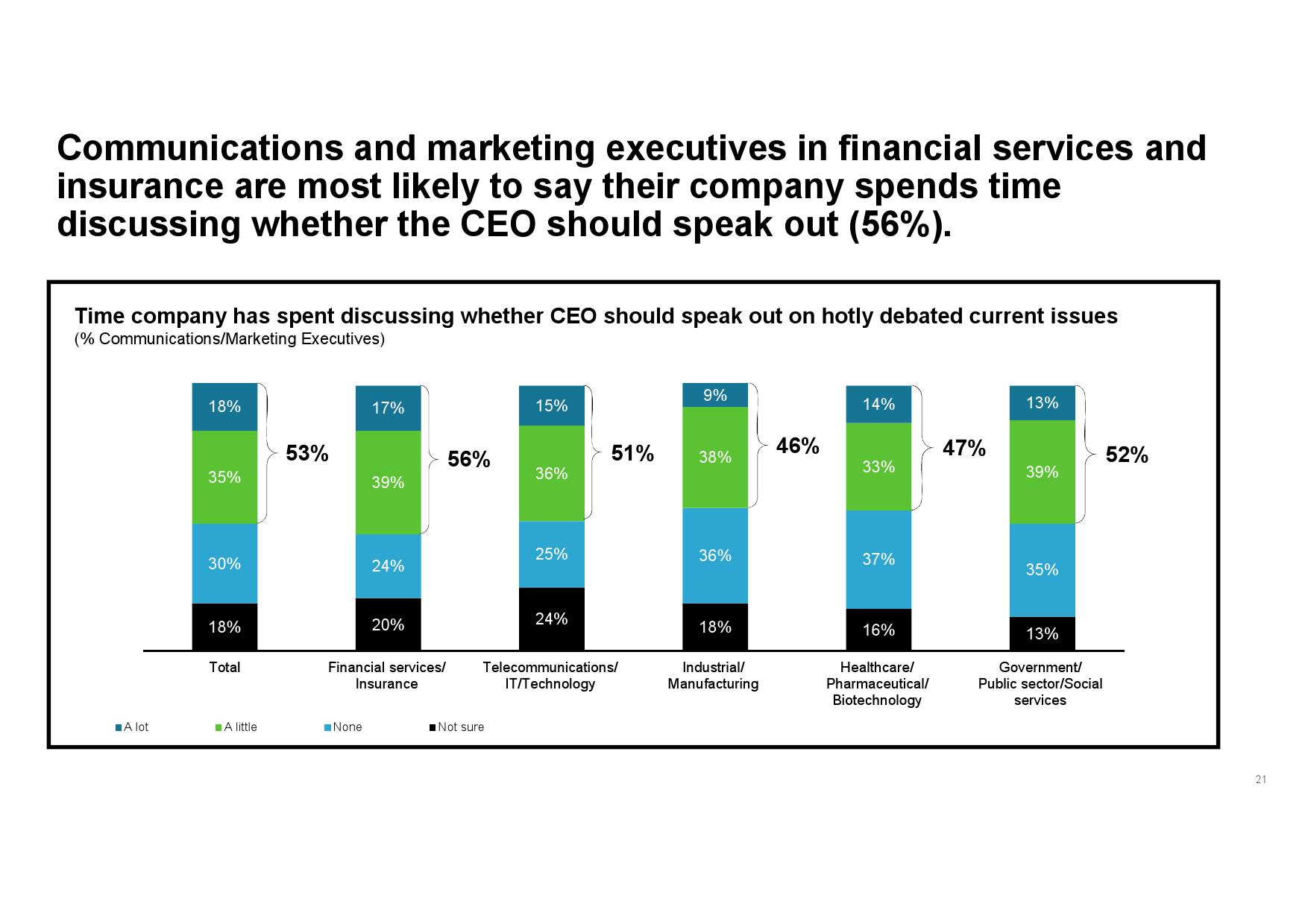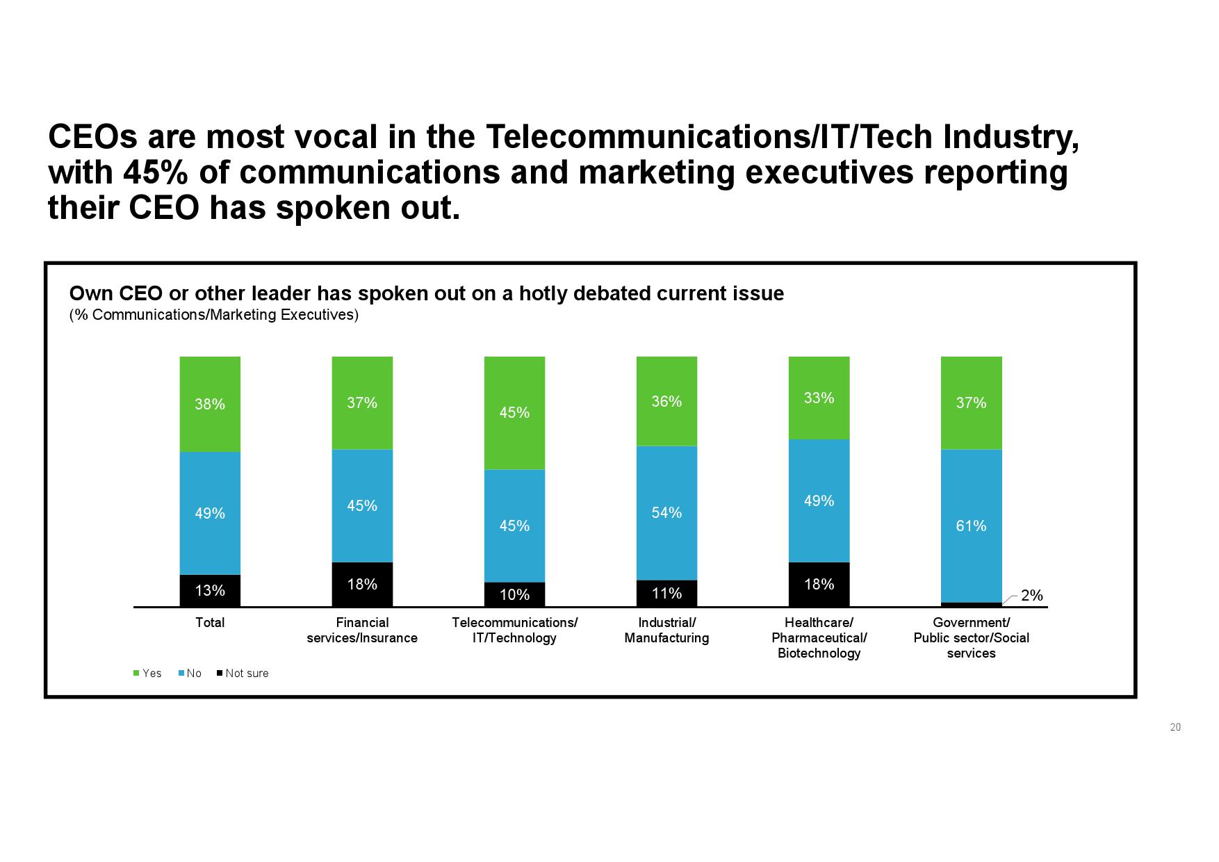 - 认识企业声誉优势。虽然传播和营销高管承认CEO行动力存在一定风险,但其为公司所产生的声誉优势更突出。此外,在CEO已经公开发声的企业中,传播和营销高管所承受的感知风险更低,同时公司也会从中受益,尤其在其与公司价值观和原则一致的情况下。