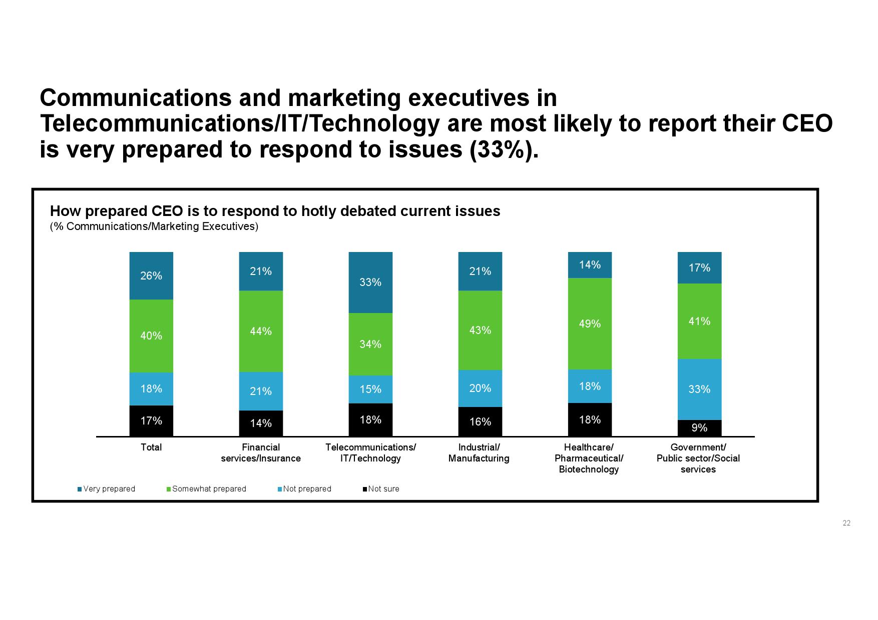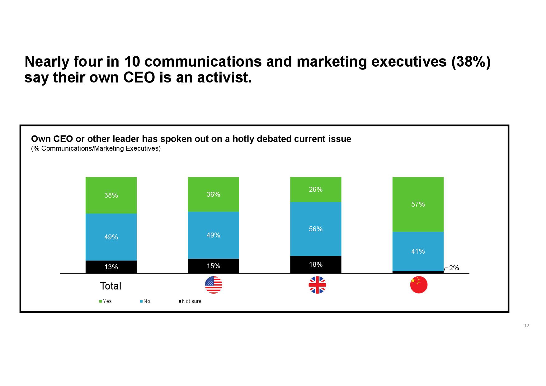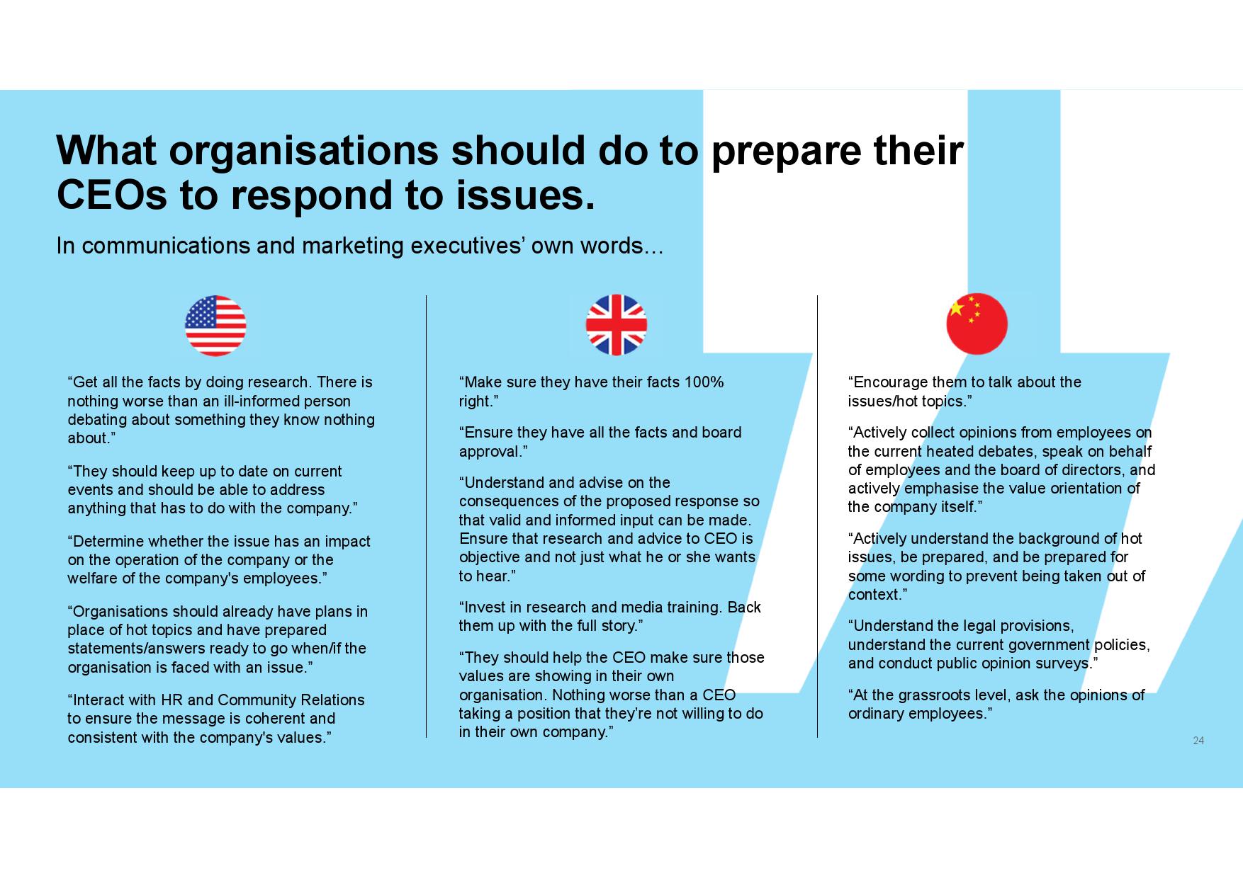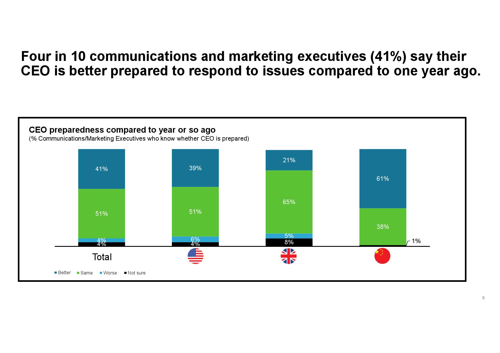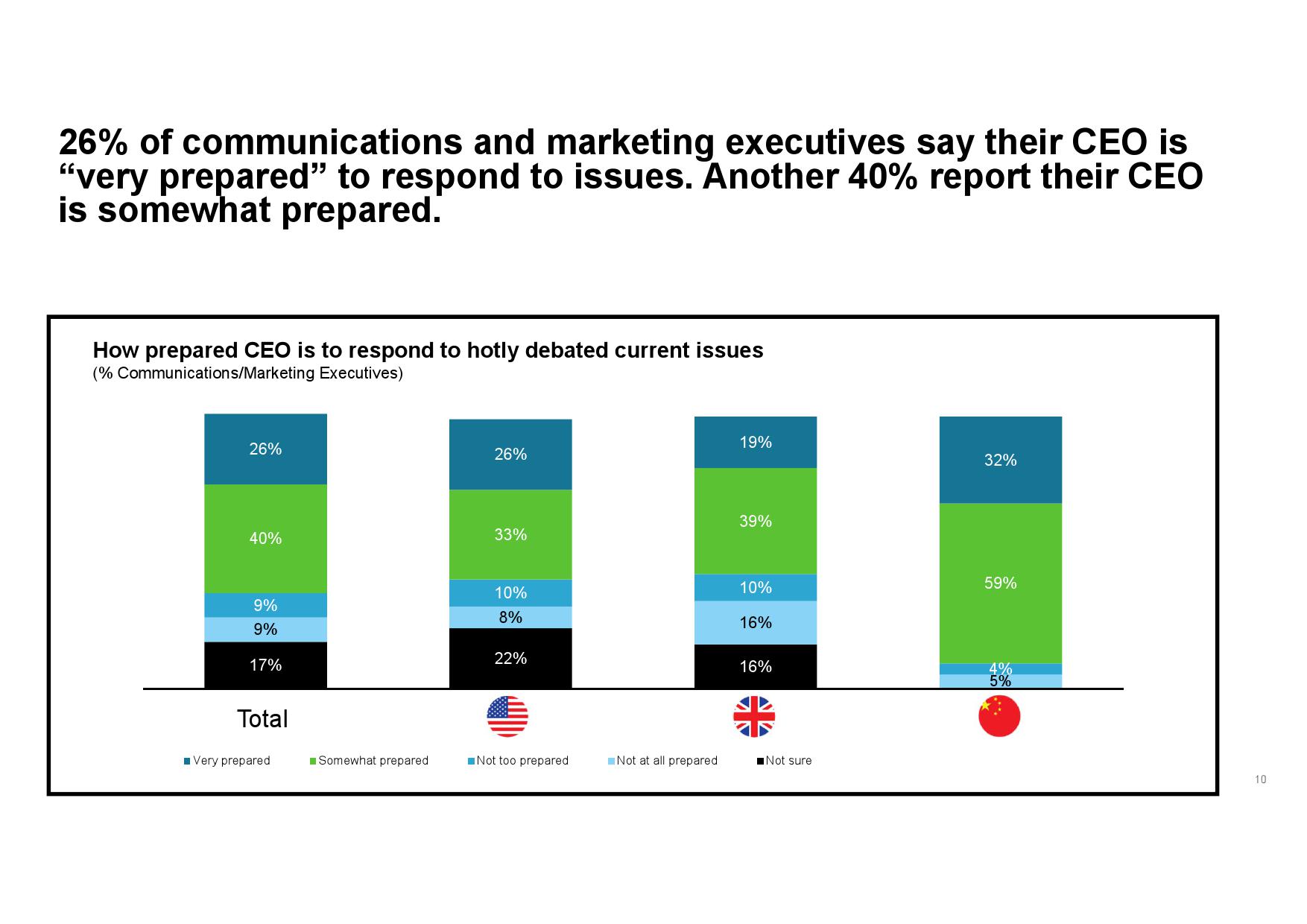 据调查显示,仅26%的传播和营销高管称其CEO对热点问题的发声做好“周全”准备。三分之一(35%)的人则表示其CEO并没有做好充足准备,或所知甚少。由此观之,高层领导者在行动力方面还有很大的改进空间。不过,该情况得到了改善,在那些知道其CEO是否作好回应准备的受访者中,41%表示其CEO比前一年准备得更加充分,仅4%认为其CEO准备得不如前一年。