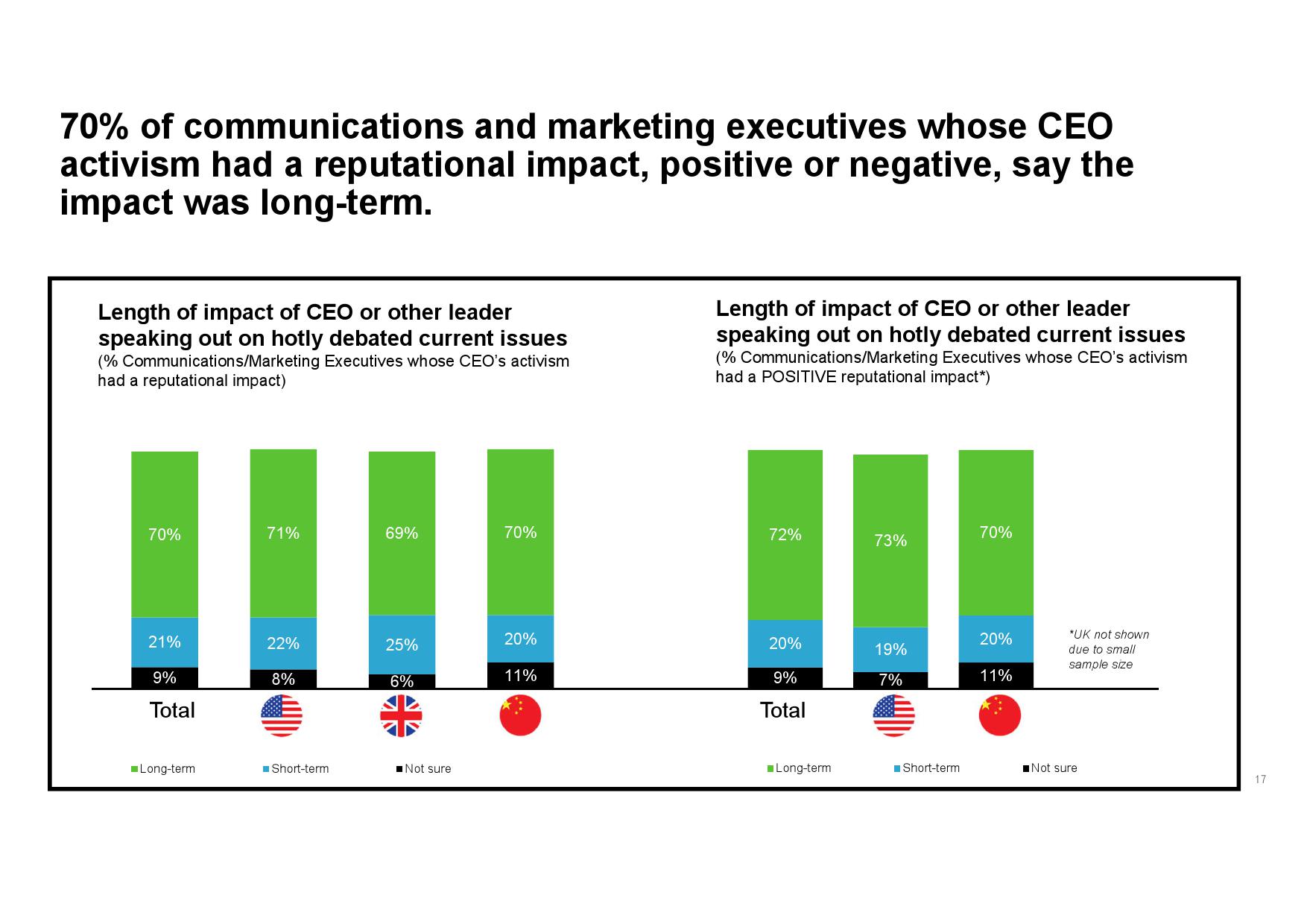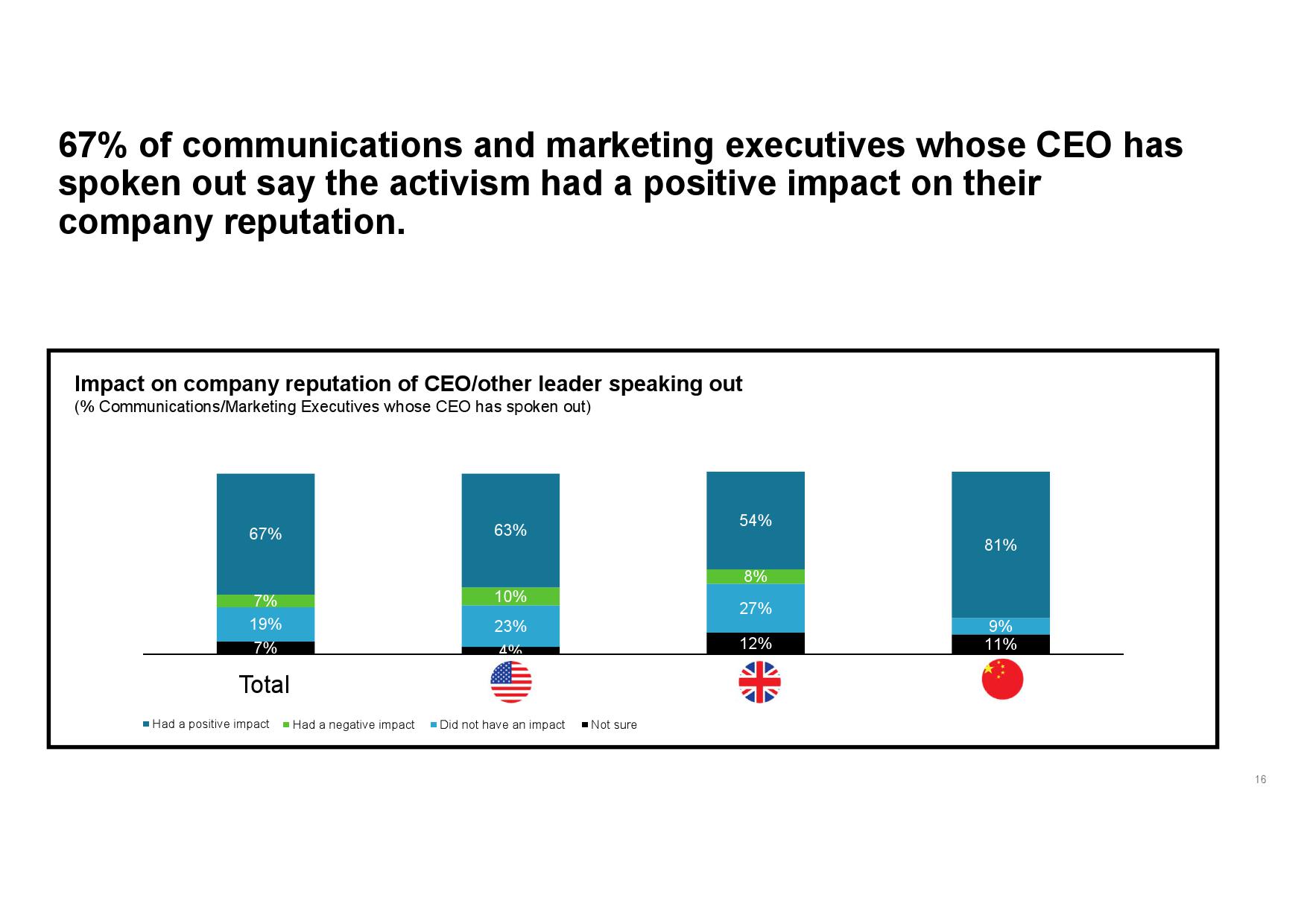 CEO行动力有助于改善企业声誉。67%传播和营销高管表示,CEO发表意见后,对公司声誉产生正面影响的可能性大于负面影响。认为带来正面影响的人中,高达72%称这种影响将是有长期深远意义的。甚至在那些CEO对热点问题采取缄默态度的企业中,多达一半(51%)的传播和营销高管认为, CEO的公开发声将会对公司声誉产生较大的积极影响。