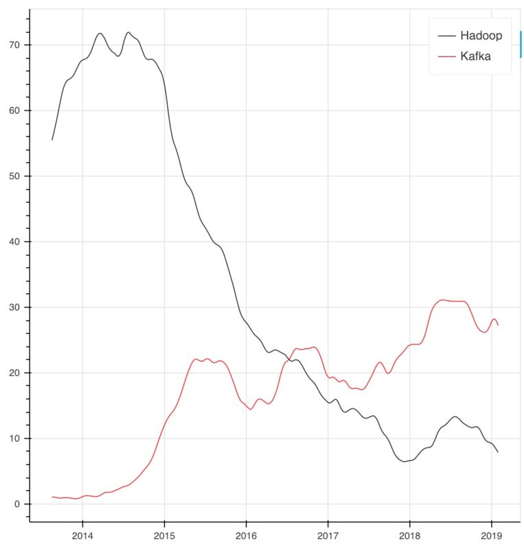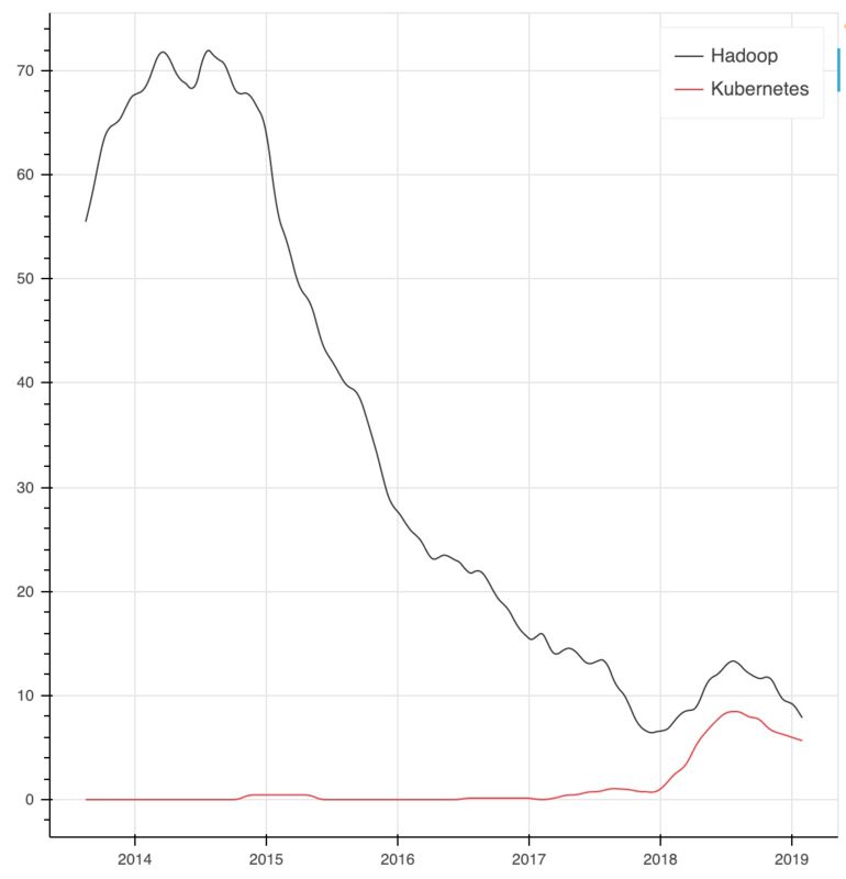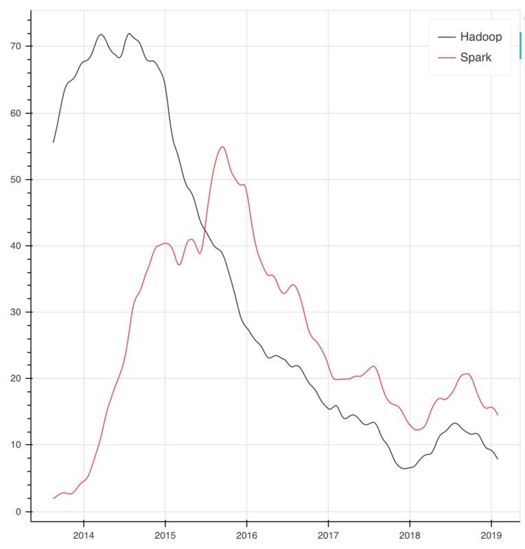 从 2013 年 Spark 开始接管 Hadoop 的那一刻起,Hadoop 就开始稳步下滑。