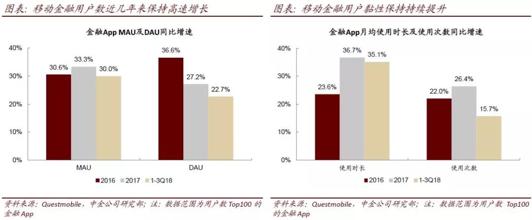 中金:互联网金融十大趋势 自2015年开启的互金整改开始,互联网金融的行业发展从野蛮生长到泥沙俱下,政策背景从监管套利到持牌经营,竞争格局从颠覆重构到牵手合作。截至今日,除了依然有待进一步化解的P2P/ICO等存量风险之外,我们看到整个金融体系对于消费者和小微商户的覆盖得到显著提升。往前看,在日臻完善的监管框架下,无论是积极转型拥抱科技的领先金融机构,还是流量/数据/技术优势显著的互联网巨头,都有机会共同开垦金融服务下沉的增量市场。 通过剖析2014年以来互联网金融各个细分领域的用户数据,我们总结行业发展的十大趋势如下: 1、移动金融用户数高速增长,渗透率仍有较大提升空间 2014年以来金融领域的移动化趋势强劲,金融领域App的MAU(月活跃用户数)及DAU(日活跃用户数)保持高速增长态势。往前看,我们认为移动金融渗透率将持续提升,主要受益于:1)金融服务的持续下沉带来客户基数的扩大;2)技术驱动下线上可开展业务继续拓展、用户体验不断改善;3)传统金融机构在成本效率考量下优化线下布局、继续加码线上场景建设。特别值得提出,头部金融机构在科技尤其是金融App的投入明显加大,而且用户体验更加友好,从原来单纯堆积功能进行转变,更加重视界面、体验、流程等细节。 2、政策及市场环境带来波动,关注指标从规模转向黏性 就户体量整体而言,支付及网上银行类App用户数较高,理财及现金借贷类App次之,保险类App用户数相对较少;从用户增速对比角度看,股票交易类受资本市场影响、P2P理财类受监管洗牌影响;从集中度角度看,支付结算领域受支付宝一枝独秀影响而集中度较高,现金借贷领域行业则呈现出百花齐放的分散格局;用户黏性角度看,股票及理财人均单日使用时长及次数较高。 3、传统金融VS. 互联网公司:数量已相当、质量需提升 我们定义月活高于500万或日活高于100万的37个金融移动应用为头部App,我们发现除了支付宝一骑绝尘之外,传统金融和互联网公司从数量上来看已经平分秋色。互联网公司在用户运营上优势明显,传统金融机构在客户黏性方面依然有较大提升空间。 4、互联网降维打击“二元化”,零售端竞争局面方兴未艾 互联网降维打击二元化,即互联网公司对传统金融的冲击仍将持续;头部金融机构拥抱互联网,拉大了与中小金融的“数字鸿沟”。大型金融机构转型成效逐渐显现的同时,中小金融机构所面临的挑战依然较大。互联网公司对传统金融的冲击仍将持续,证券/基金领域影响高于银行/保险。 5、互联网公司寡头格局初定,二线巨头或追求单点突破 互联网金融的“两极”格局初定,缺失移动支付船票的二线互联网公司或更多追求单点业务突破,金融牌照战略布局的重要性日益凸显。 6、支付的入口地位愈发重要,生态布局上蚂蚁更胜一筹 支付宝业已成为金融生活一站式服务平台。蚂蚁金服通过支付宝入口提供无可比拟的服务深度及广度。 7、消费贷监管进一步趋严下,金融机构持牌优势在凸显 趋严监管下行业增速放缓,持牌机构快速下沉抢占市场,在资金优势及牌照加持下,持牌的商业银行、消费金融公司在消费信贷市场保持稳健增长。 8、股票基金受市场波动较大,行业龙头逆市提升市占率 股票基金领域显著受市场的周期性影响,整体而言,侧重资讯属性的股票App人均单日时长更高。龙头的成长性体现在市场规模的波动上升及市占率的提升。 9、互联网保险获客成本过高,独立渠道发展仍处探索期 互联网保险的大规模盈利短期可能是“伪命题”。尽管我们观察到领先互联网保险平台的保费规模保持高速增长势头,但线上独立保险App的用户数整体偏低。在经历了线上销售的1.0阶段、场景销售的2.0阶段,到如今保险科技的3.0阶段,互联网保险的空间巨大,同时挑战也较大。 10、估值呈现冰火两重天局面,平台模式最大化用户价值 金融科技公司的估值出现巨大分化。我们认为在行业越过野蛮生长、迎来趋严监管背景下,互联网巨头更有机会能凭借自身积攒的流量/数据/技术实力,赋能传统金融机构在做大蛋糕的同时分享收益。 更多阅读:中金:从商业模式,产品和应用市场看中国功率半导体企业的发展机会星传新材完成数亿元B轮融资 衢州产投领投 老股东中金浙大友创跟投中金:再次下调全球手机出货预测,提示需求二次探底风险中金:网游市场报告数据中金:供给因素或是出口超预期的主因苏宁金融研究院:2020年一季报互联网金融行业苏宁金融研究院:2018年Q3互联网金融行业报告支付宝:2025年余额宝累计收益超5000亿元腾讯安全:2018上半年互联网金融安全报告苏宁金融研究院:2018年Q1互联网金融行业报告2017年中国电信互联网金融大数据报告互联网周刊:2016年度中国互联网金融百强排行榜金融蓝皮书:中国互联网金融行业分析与评估(2016~2017)中、美、英三国互联网金融发展状况对比巴曙松:互联网金融创新发展的五大趋势
