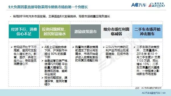 纵观整个经济市场,造成乘用车销售市场负增长的因素有很多,如宏观经济处于下行周期,居民可支配收入增长乏力;投资问题频发,P2P暴雷的声音不觉入耳;购置税优惠政策提前透支了部分用车需求,市场开始逐步进入政策刺激后的恢复及调整阶段;以SUV为代表的汽车红利产品市场开始疲软;所有的汽车厂商不但要面临新车对手的竞争更需要面临和二手车的竞争,在市场总需求量一定、中国整体汽车存量承载能力有限的情况下,多一个客户选择换购旧车就失去了一台新车的销售机会。