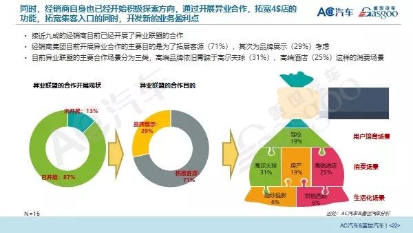 同时,接近九成的经销商目前已经开展了异业联盟的合作:经销商集团目前开展异业合作的主要目的是为了拓展客源(71%),其次为品牌展示(29%)考虑;目前异业联盟的主要合作场景分为三类,高端品牌依旧青睐于高尔夫球(31%)、高端酒店(25%)这样的消费场景。