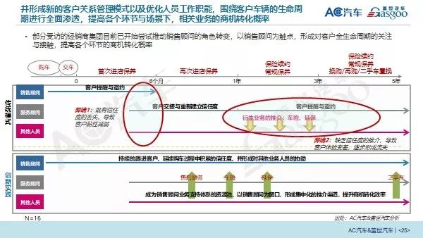 - 消费者与销售人员最易建立信任度,并直接创造优质、高效的衍生产品营销商机;随着消费者的服务责任向店内其他工作人员转移,该优势逐步减弱,并导致商机的流失,因此优化店内工作人员的职能协作机制,升级4S店运营理念,是最大化开发基盘客户价值的核心要素之一;