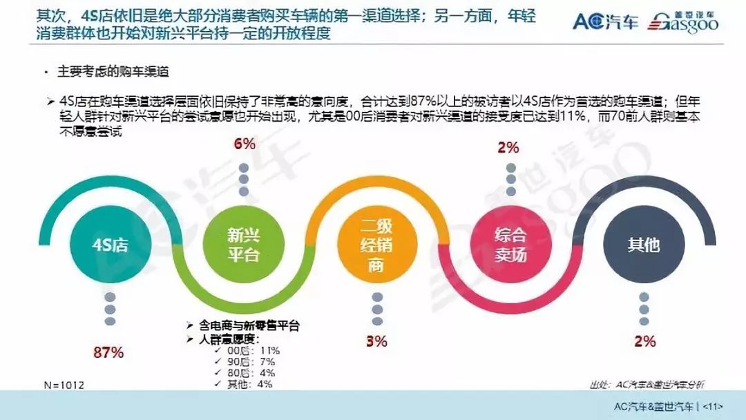 - 正规化、高度重视消费者体验的4S店,仍旧是绝大部分消费者的购车首选渠道;但未来4S店也需要进一步强化线上营销能力、丰富线上营销模式,迎合新一代年轻消费主力人群(90/00后消费群体)的消费习惯;