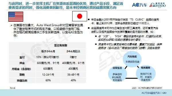 在这方面,美国和日本等主机厂发挥资源体系层面的优势,通过产品手段,满足消费者需求的同时,强化消费者的黏性,值得关注:如在美国与加拿大,Auto West Group针对亚裔留学生提供了融资租赁方式的购车方案,以规避银行信用门槛,并在租约期满后提供二手车买断选择。