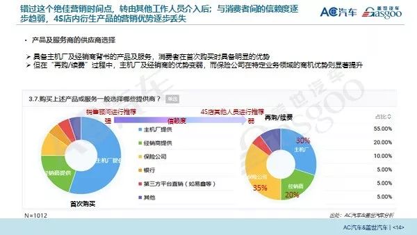 5、具备主机厂及经销商背书的产品及服务,消费者在首次购买时具备明显优势;但在“再购/续费”过程中,主机厂及经销商的优势变弱,而保险公司在特定业务领域的商机优势则显著提升;
