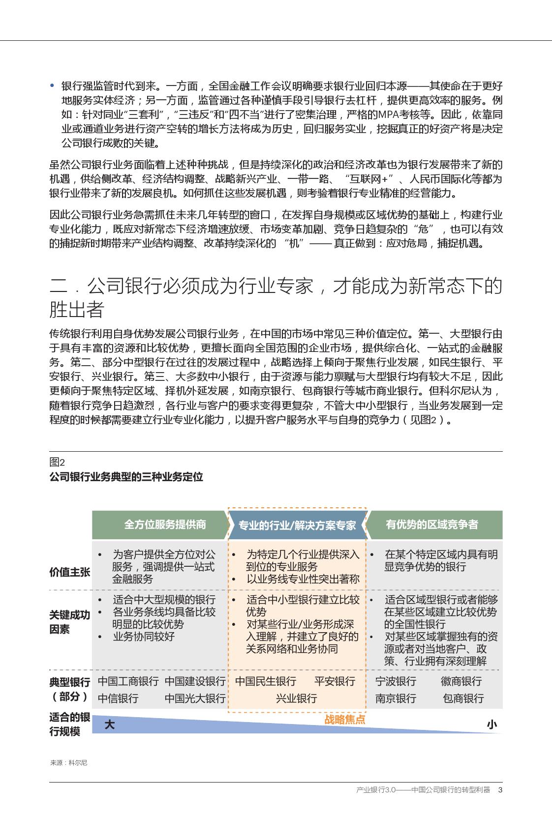 经济进入新常态,中国银行业面临经济转型的压力,加之近期金融强监管的到来,占据半壁江山的公司业务也亟需思考如何转型。但另一方面,供给侧改革、战略新兴产业、一带一路这样的行业机遇或将为银行业带来新的发展良机。因此,如何抓住转型窗口期,发挥自身规模或区域优势,构建行业专业化能力,转危为机,是银行管理者需要思考的战略方向,而找到机会之后如何迅速建立行业专业化的差异优势并打造高效的内部机制,则考验着银行专业精准的经营能力。