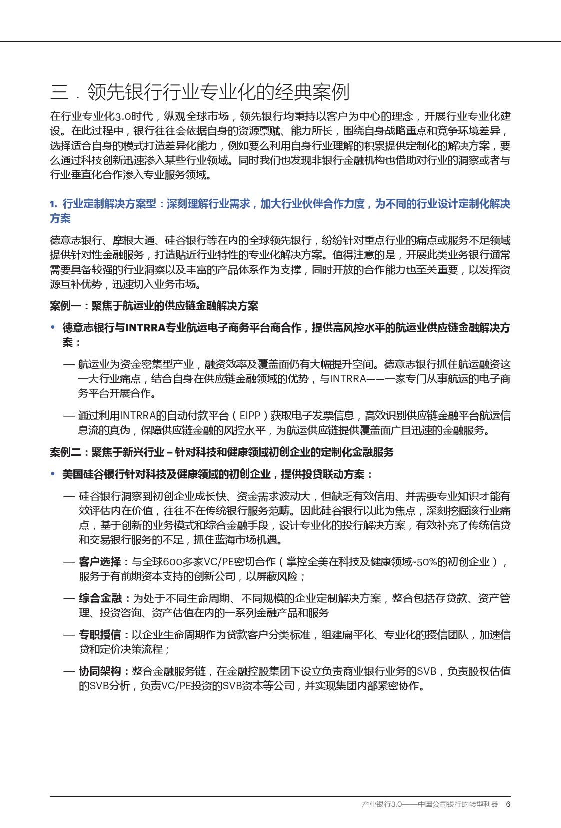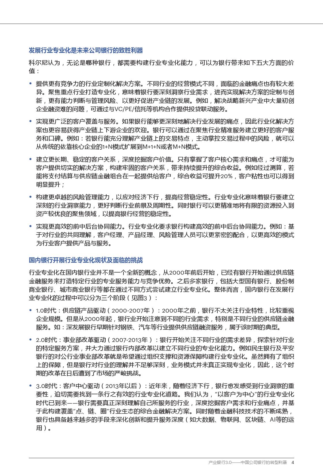 本世纪初始,国内银行从重点关注企业规模到开始注重行业特性,逐步开启了以供应链产品驱动的1.0时代。之后,许多大型银行试水内部事业部改革,利用组织与资源保障,尝试专业化之路,可以说进入了以事业部改革驱动的2.0时代。而今,银行需要真正理解行业痛点和客户需求,构建覆盖“点、链、圈”行业生态的综合解决方案,全面步入以客户需求驱动的3.0时代。但是在探索产业银行过程中往往遇到行业洞察不足、客户服务能力有限、创新乏力以及内部支持缺失等一系列挑战,这也导致了中国并未出现真正专业的产业银行。