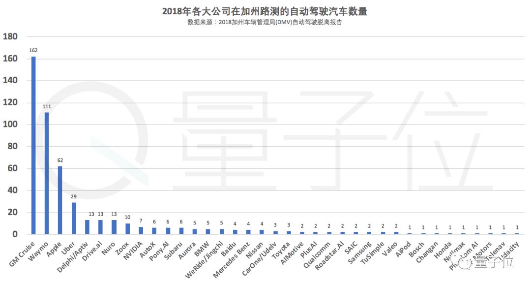 持有加州路测许可证的公司一共有62家,但其中部分公司2018年没有进行路测,比如博世;还有一部分公司因为取得时间较晚,DMV没有要求他们提交2018年的报告,比如图森;另外的一些公司没有接管的数据。