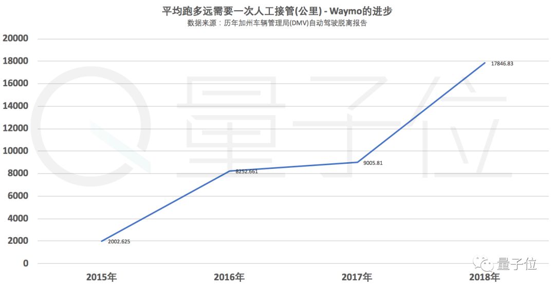 2015年,Waymo测试的总里程为682,895公里,人工接管次数次数仅为341次,平均人工每接管一次,就能跑2003公里。这个水平,放到2018年,仅次于通用Cruise和Zoox。
