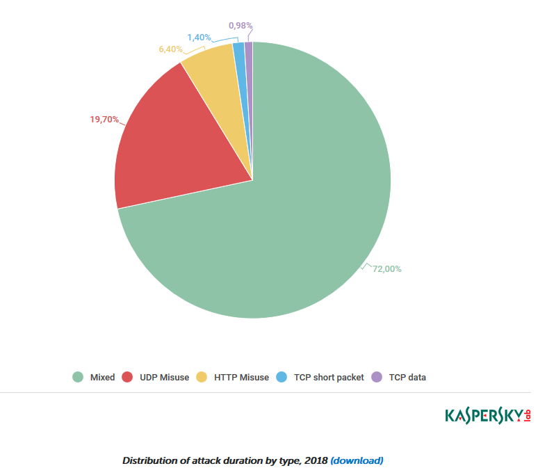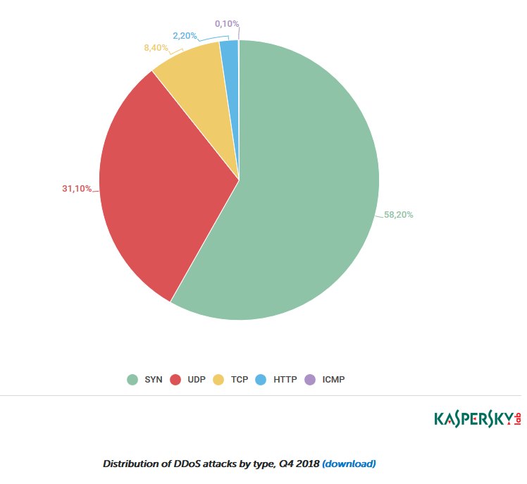 UDP洪水的比例大幅增加,几乎占所有攻击的1/3(31.1%)。然而,SYN洪水仍然领先(58.2%)。