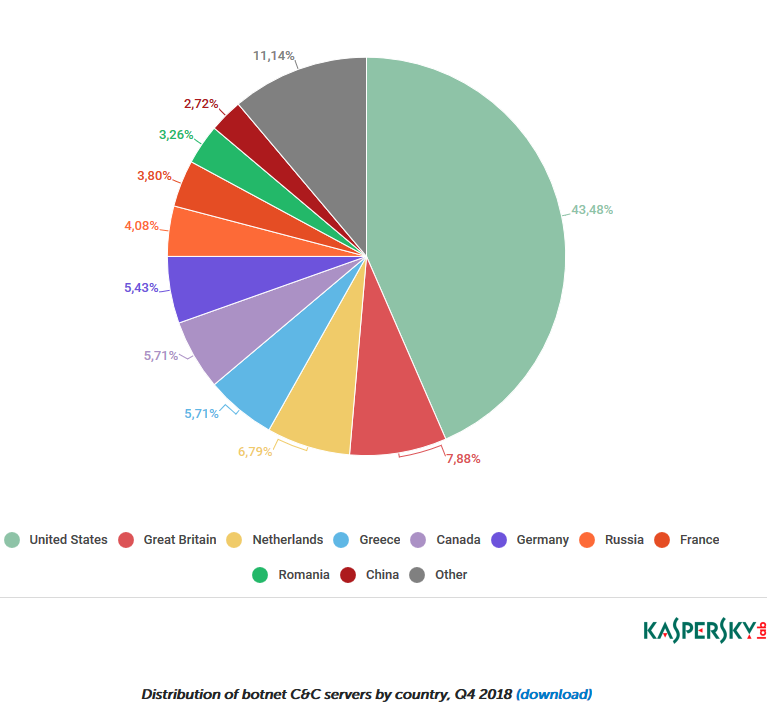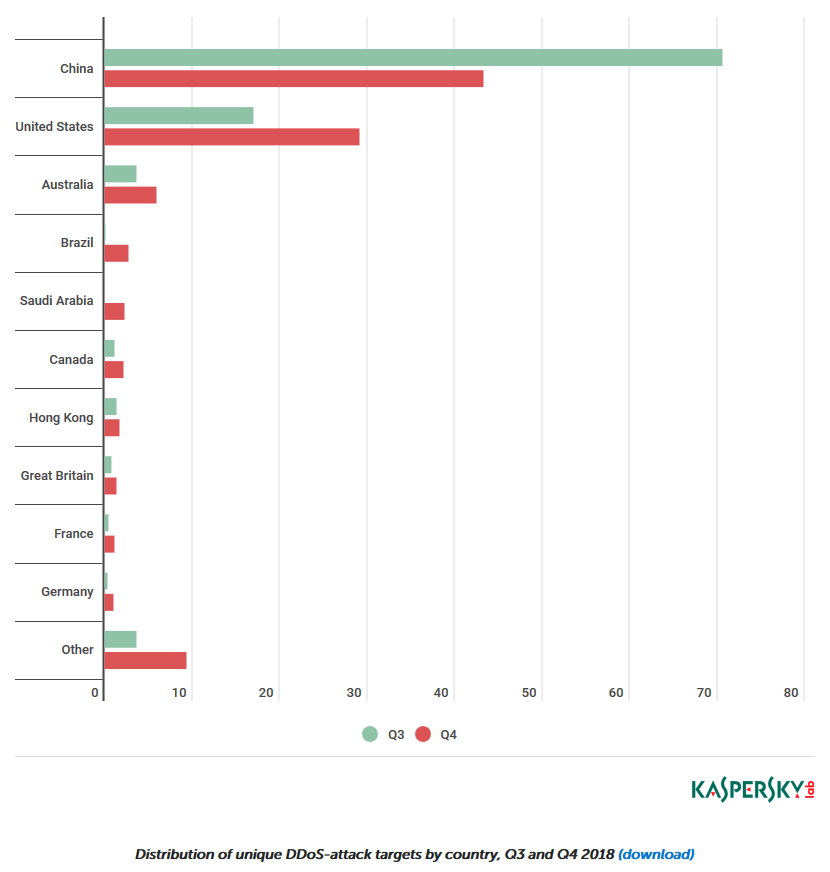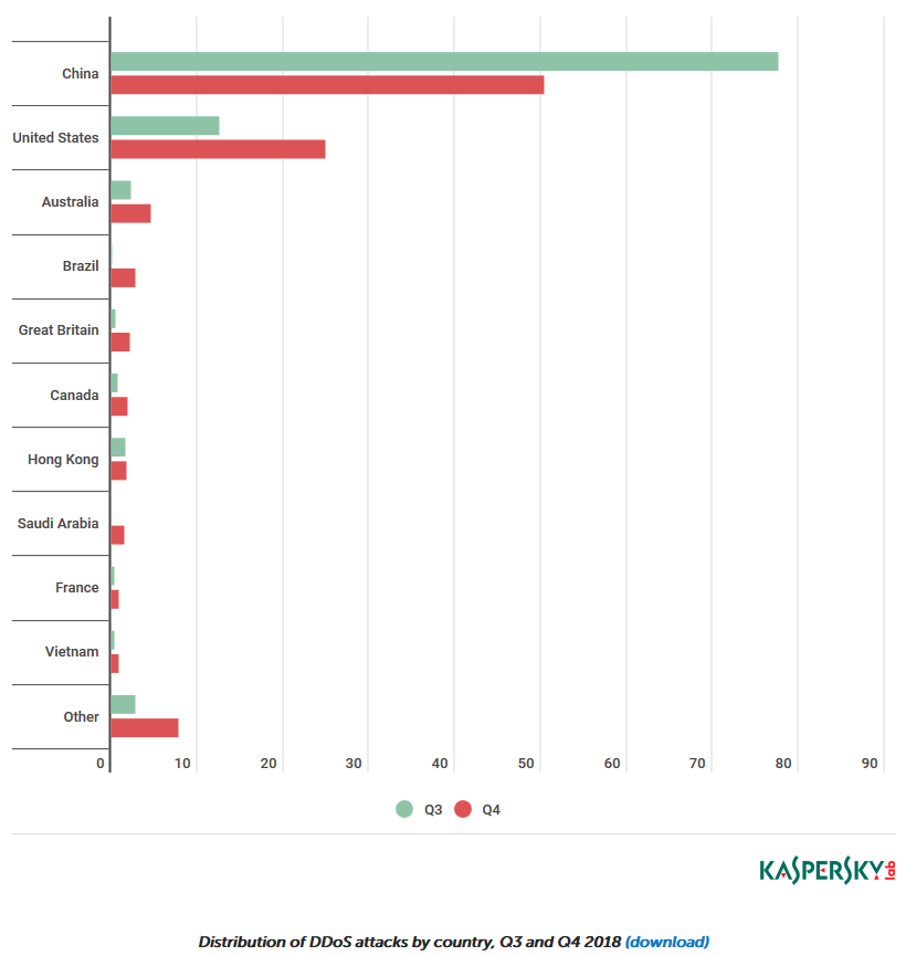 2018年的最后一个季度,中国仍然占DDoS攻击的大多数,但份额下降了20%以上,从77.67%降至50.43%。