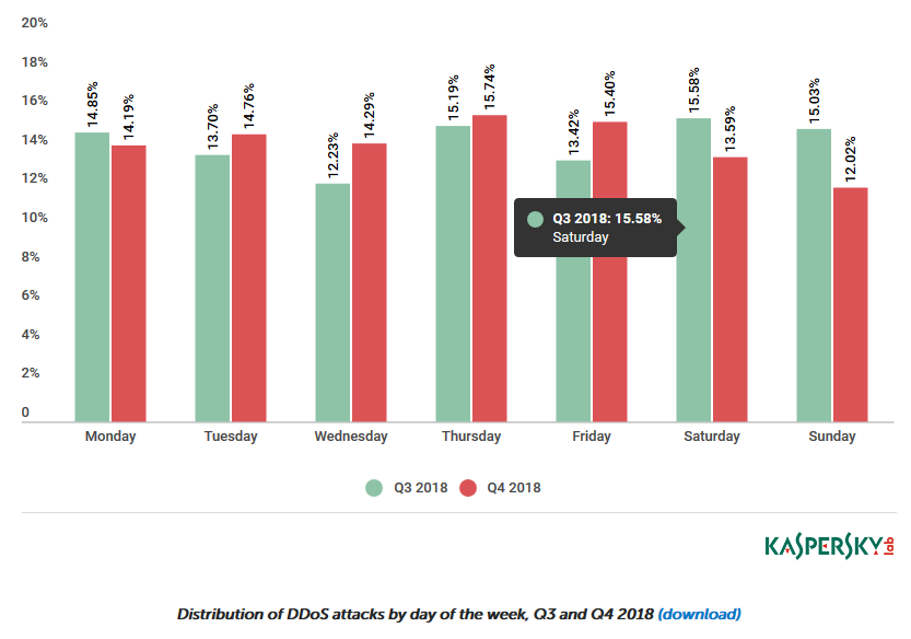 2018年DDoS活动比前一年减少了13%。由于异常活跃的9月,第三季度的攻击量超过了2017年第三季度。第四季度的降幅最大,攻击数量仅为2017年同期的70%。