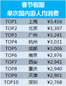 从目前预订春节国内跟团游、自由行的单次人均花费看,“消费力前十强城市”依次为上海、北京、广州、杭州、成都、南京、西安、重庆、天津和深圳。这些城市春节旅游单次国内游人均花费超过2700元,上海、北京、广州、杭州和成都超过3000元。