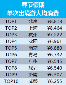 春节出境游消费力十大城市榜单公布:北京人均花费近9000元