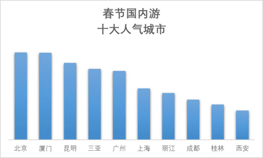 哪些国内旅游城市是今年春节的赢家?根据携程跟团游和自由行数据,最受游客欢迎的国内旅游城市前十分别是北京、厦门、昆明、三亚、广州、上海、丽江、成都、桂林和西安。