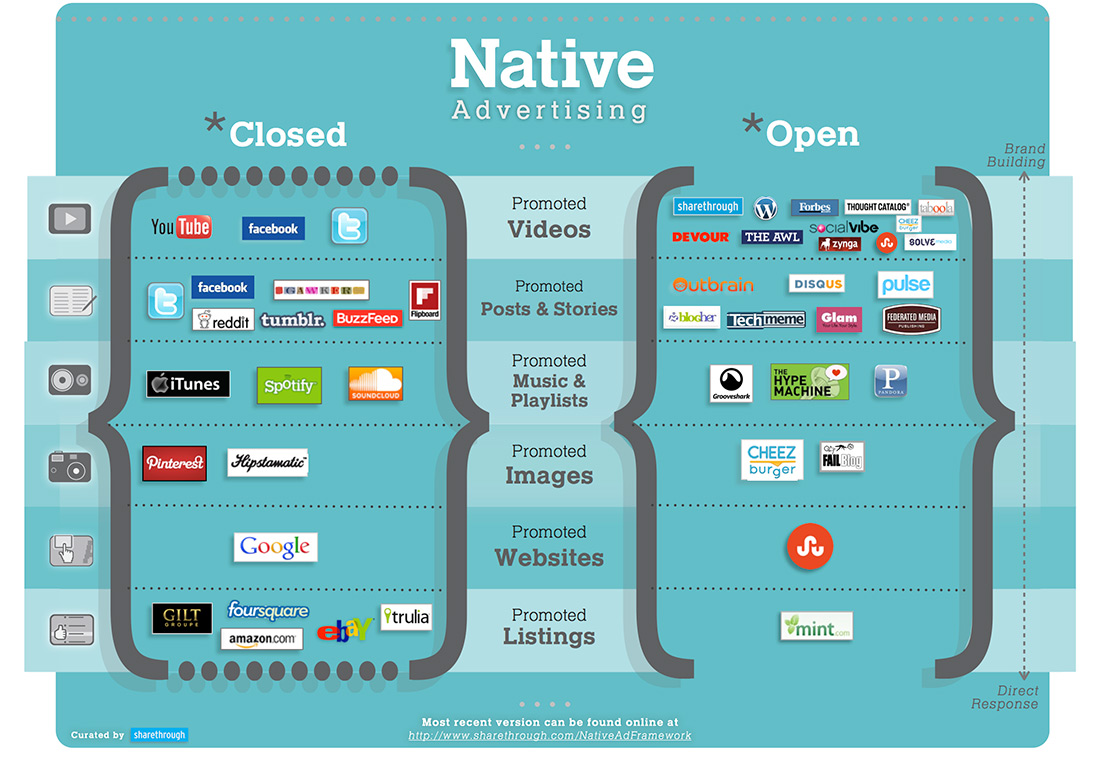 在5月份我第一次对正在崛起的原生广告市场做了总结,提出了原生广告的市场架构(如下图)。在那时,原生广告由投资人Fred Wilson提出,是个新瓶装旧酒的老概念——原生广告是一种从网站和app用户体验出发的盈利模式,由广告内容所驱动,并整合了网站和app本身的可视化设计(简单来说,就是融合了网站、app本身的广告,这种广告会成为网站、app内容的一部分,如Google搜索广告、Facebook的Sponsored Stories以及Twitter的tweet式广告都属于这一范畴)。