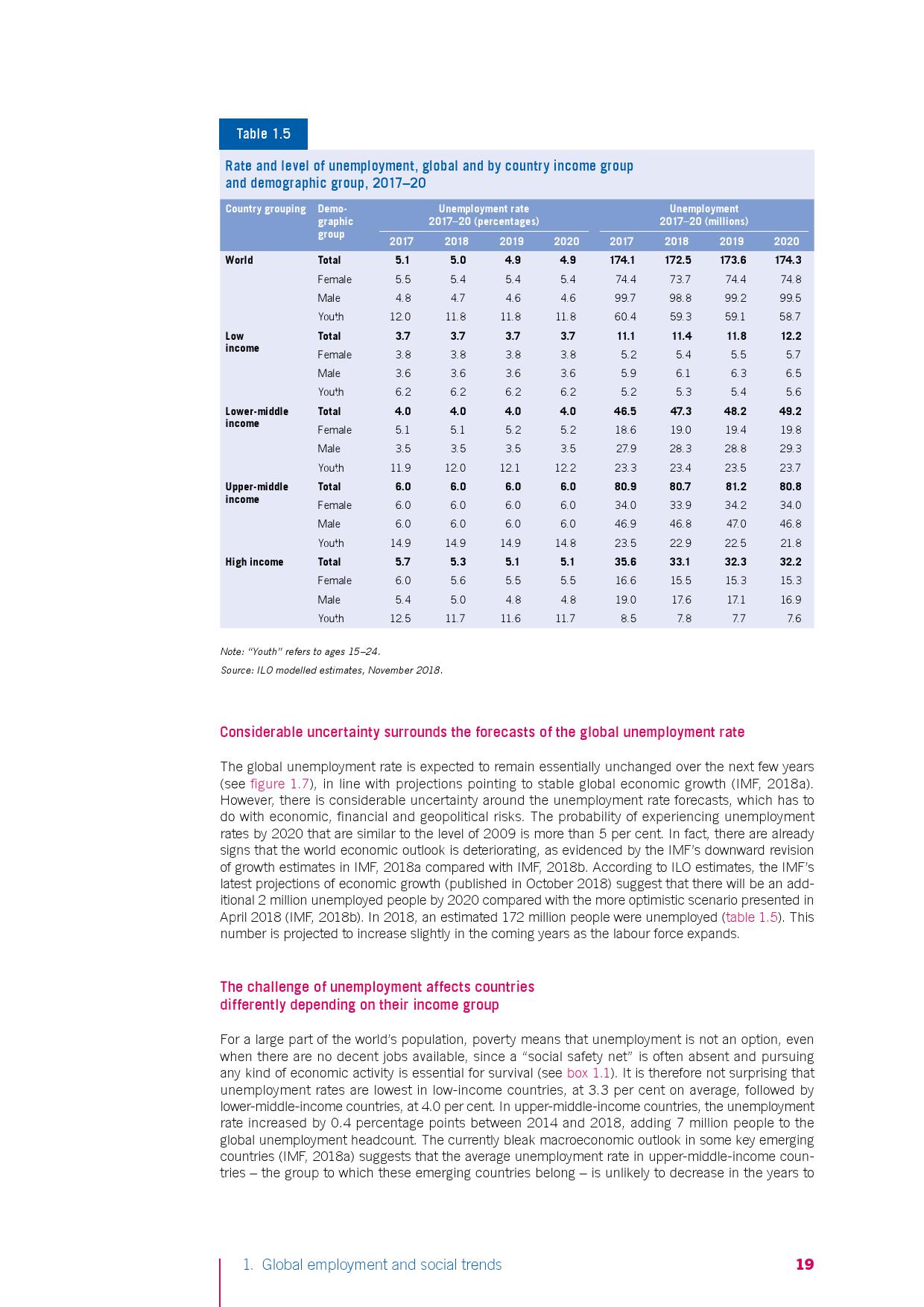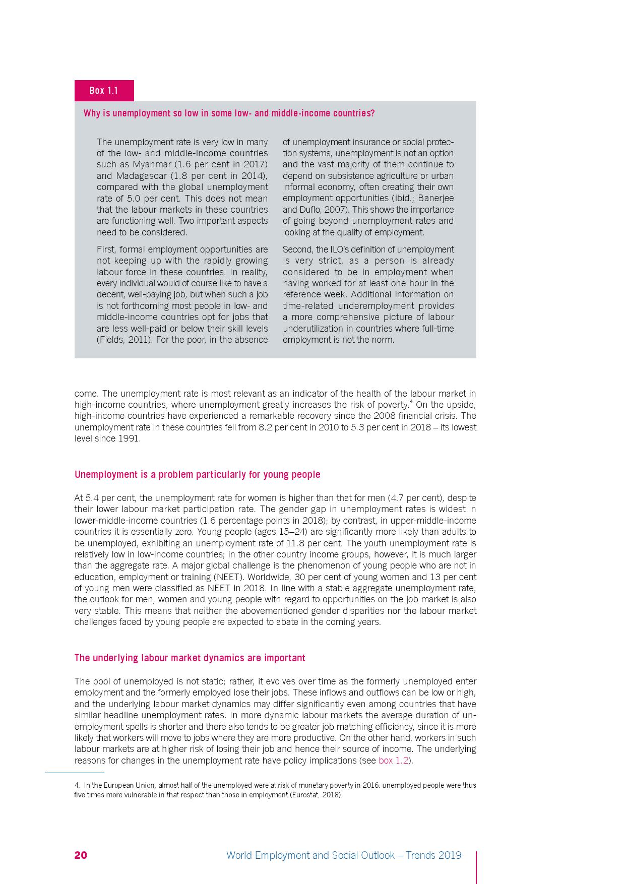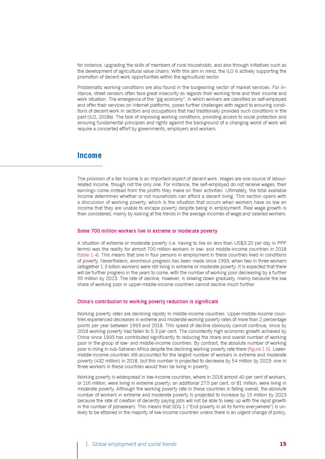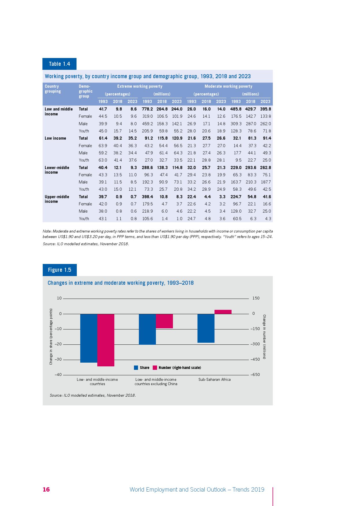 年度报告还强调了一些进展。如果世界经济能够避免重大衰退,预计许多国家的失业率将进一步下降。过去30年来,工作贫困率大幅下降,接受教育或培训人数也有所增加,特别是在中等收入国家。