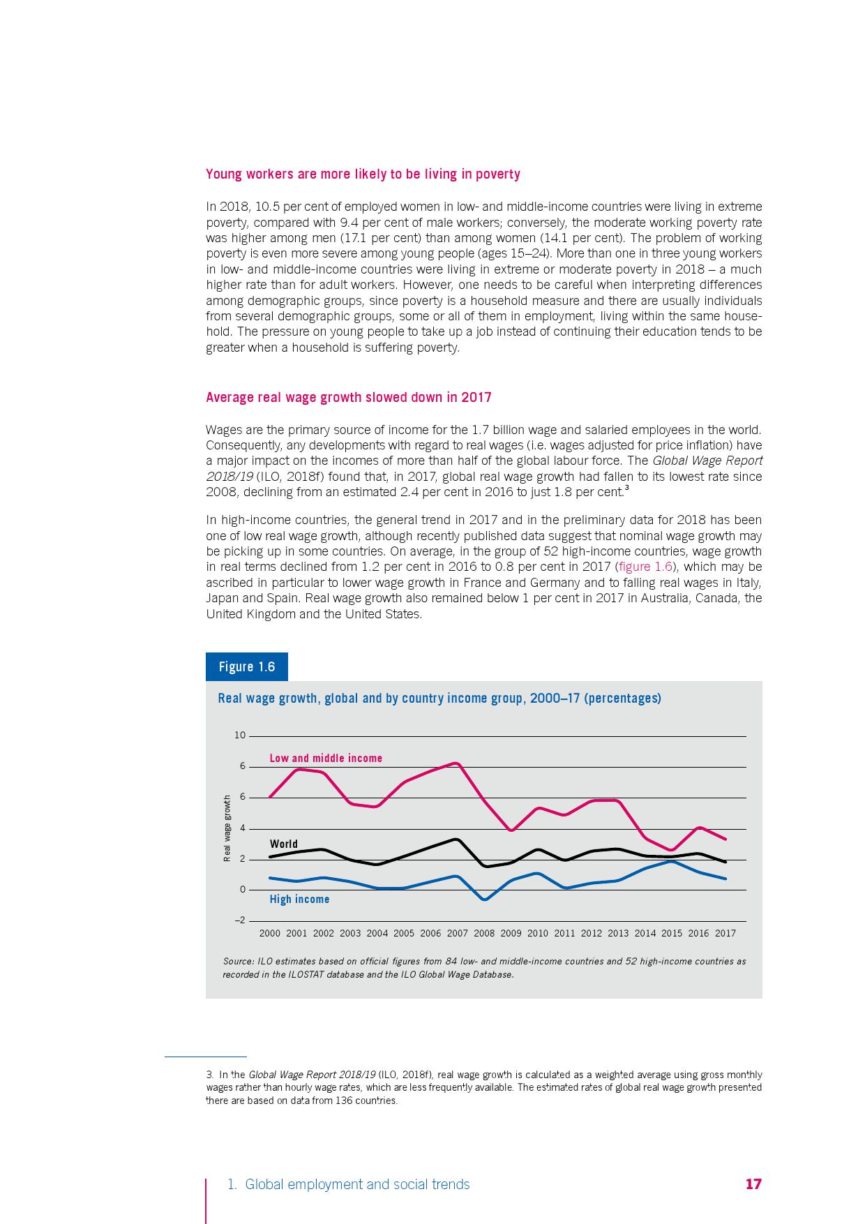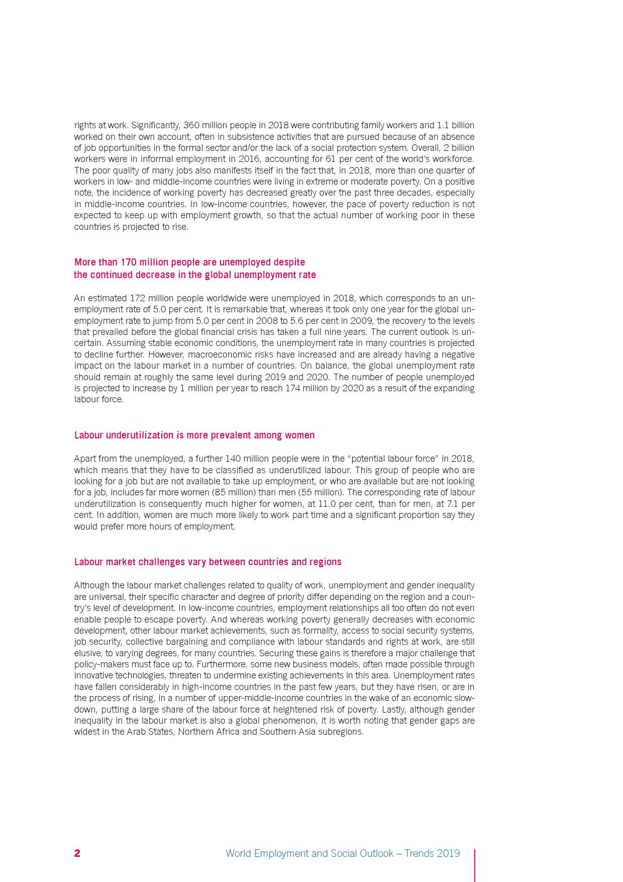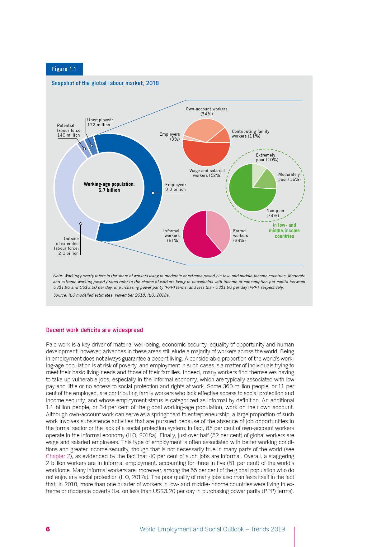 报告指出,2018年全球33亿被雇佣的人中的大部分面临不充分的经济保障、物质福利和均等机会。更重要的是,全球在减少失业方面取得的进展并没有反映在工作质量的提高上。