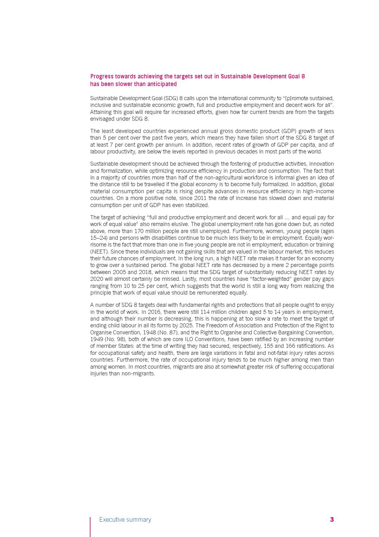 报告指出,体面劳动中存在着一些重大缺陷,并警告说,按照目前的进展速度,实现可持续发展目标所规定的人人享有体面劳动的目标(可持续发展目标8)对许多国家来说似乎并不切实际。