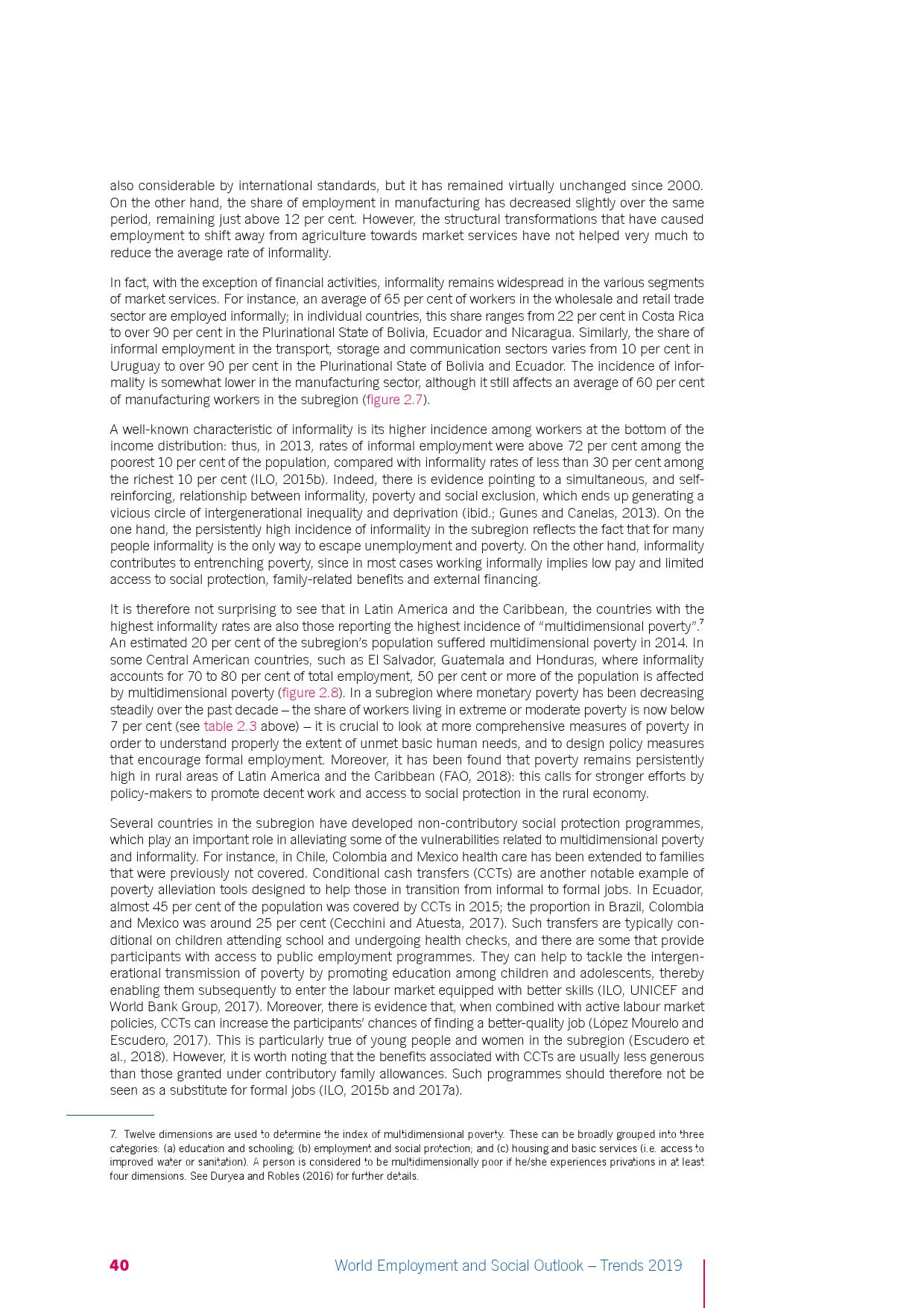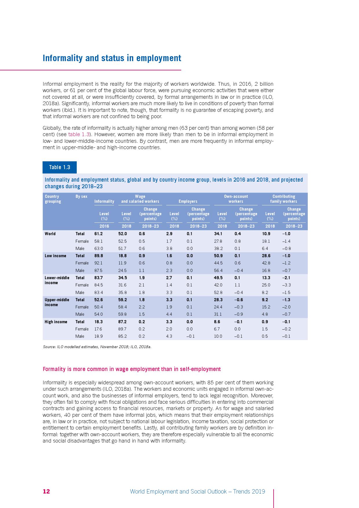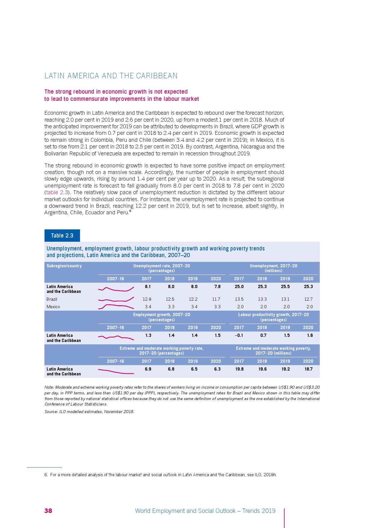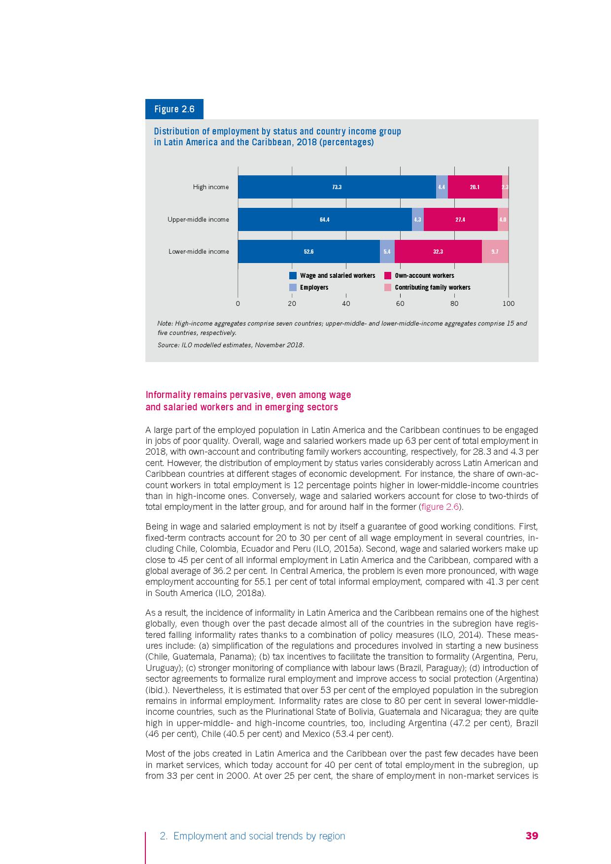在拉丁美洲和加勒比地区,尽管经济增长反弹,但预计2019年和2020年的就业人数每年仅增长1.4%。在所有类型的就业中,非正规和低质量就业仍然普遍存在。