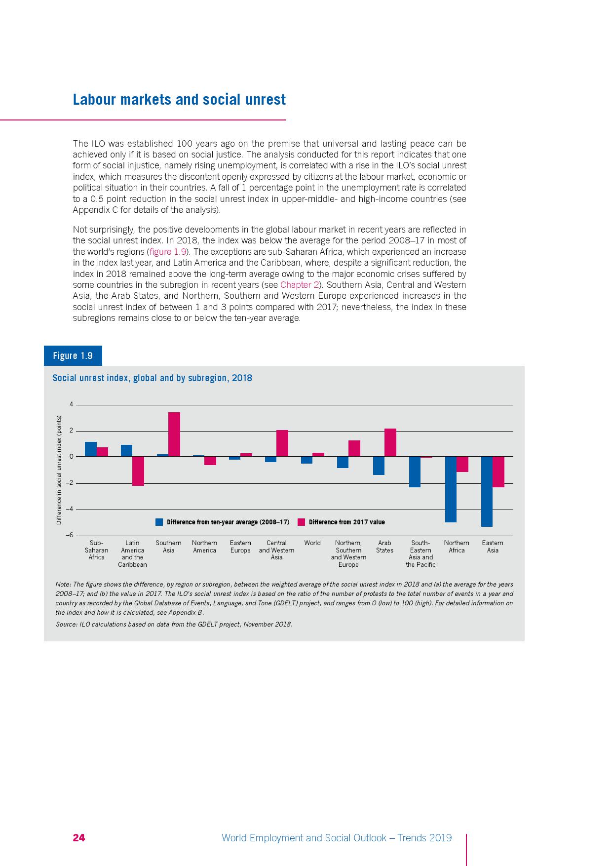在欧洲和中亚地区,在北欧、南欧和西欧,失业率处于十年来的最低水平,并将在2020年之前持续下降。在东欧,2019年和2020年的就业人数预计将减少0.7%,但同时也在不断萎缩的劳动力市场意味着失业率将下降;一些国家的长期失业率高达40%;在中亚和西亚,非正规就业仍然普遍存在,占43%。工作人口中的贫困问题、低质量就业和劳动力市场持续不平等仍令人担忧。