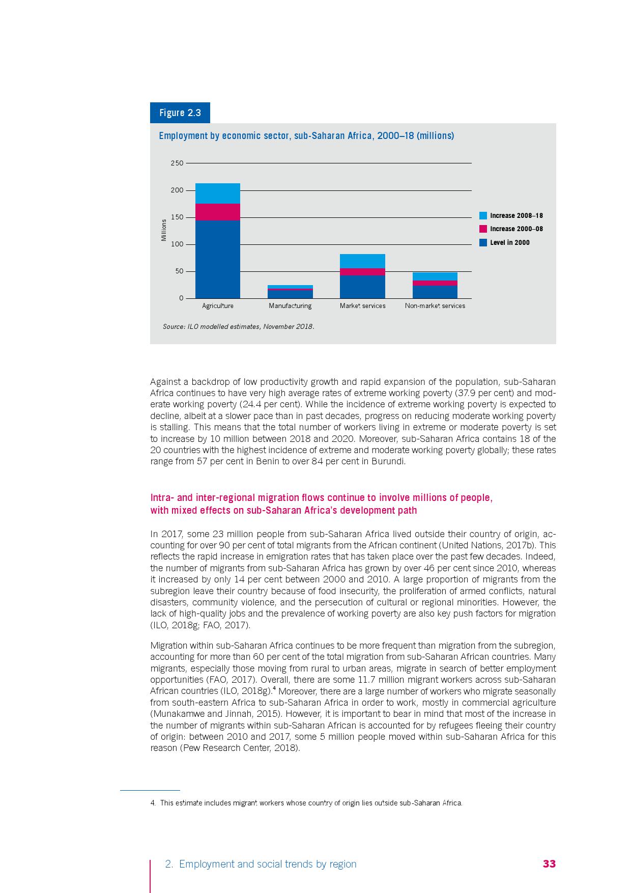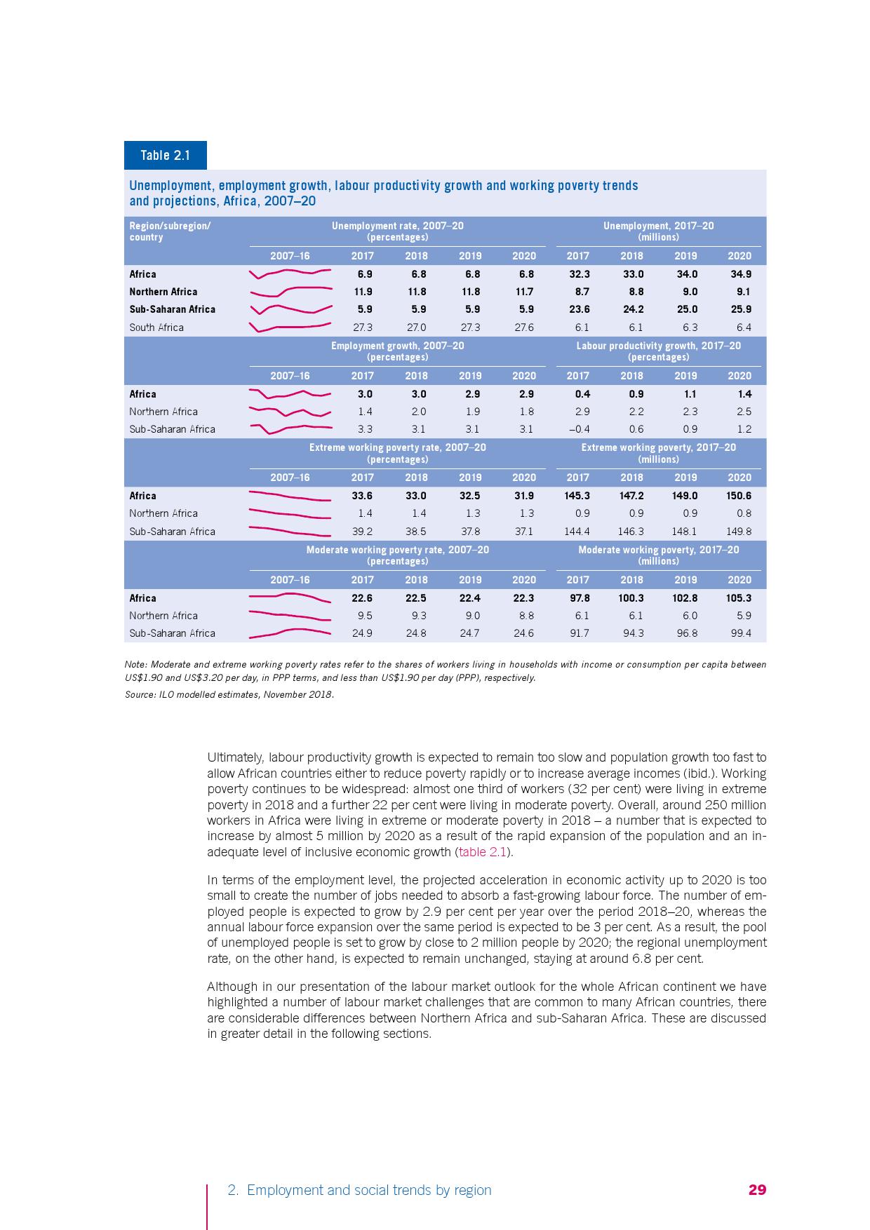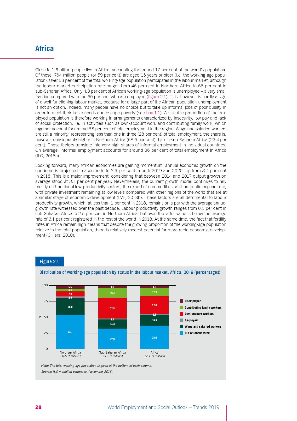 从地区来看,非洲只有4.5%的劳动年龄人口失业,60%的人就业。然而,许多工人别无选择,只能从事劣质工作,他们缺乏安全保障、体面的工资和社会保障。预计非洲劳动力人口每年将增加1400多万。预计直到2020年,非洲经济增长率都将非常低,以至于无法为这个快速增长的劳动力市场创造足够的优质就业机会。