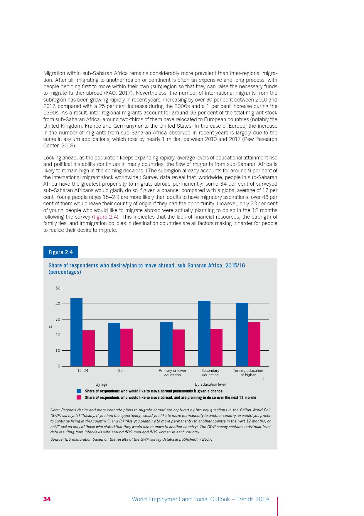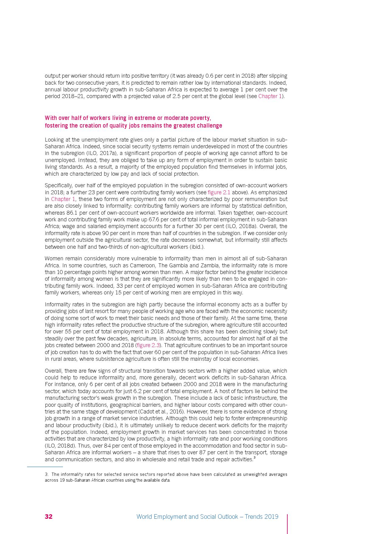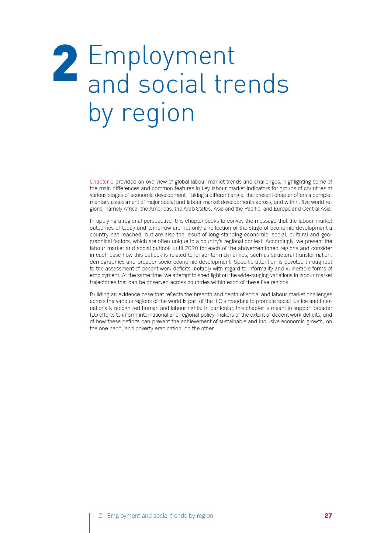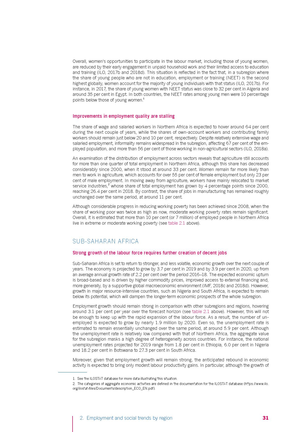 从地区来看,非洲只有4.5%的劳动年龄人口失业,60%的人就业。然而,许多工人别无选择,只能从事劣质工作,他们缺乏安全保障、体面的工资和社会保障。预计非洲劳动力人口每年将增加1400多万。预计直到2020年,非洲经济增长率都将非常低,以至于无法为这个快速增长的劳动力市场创造足够的优质就业机会。