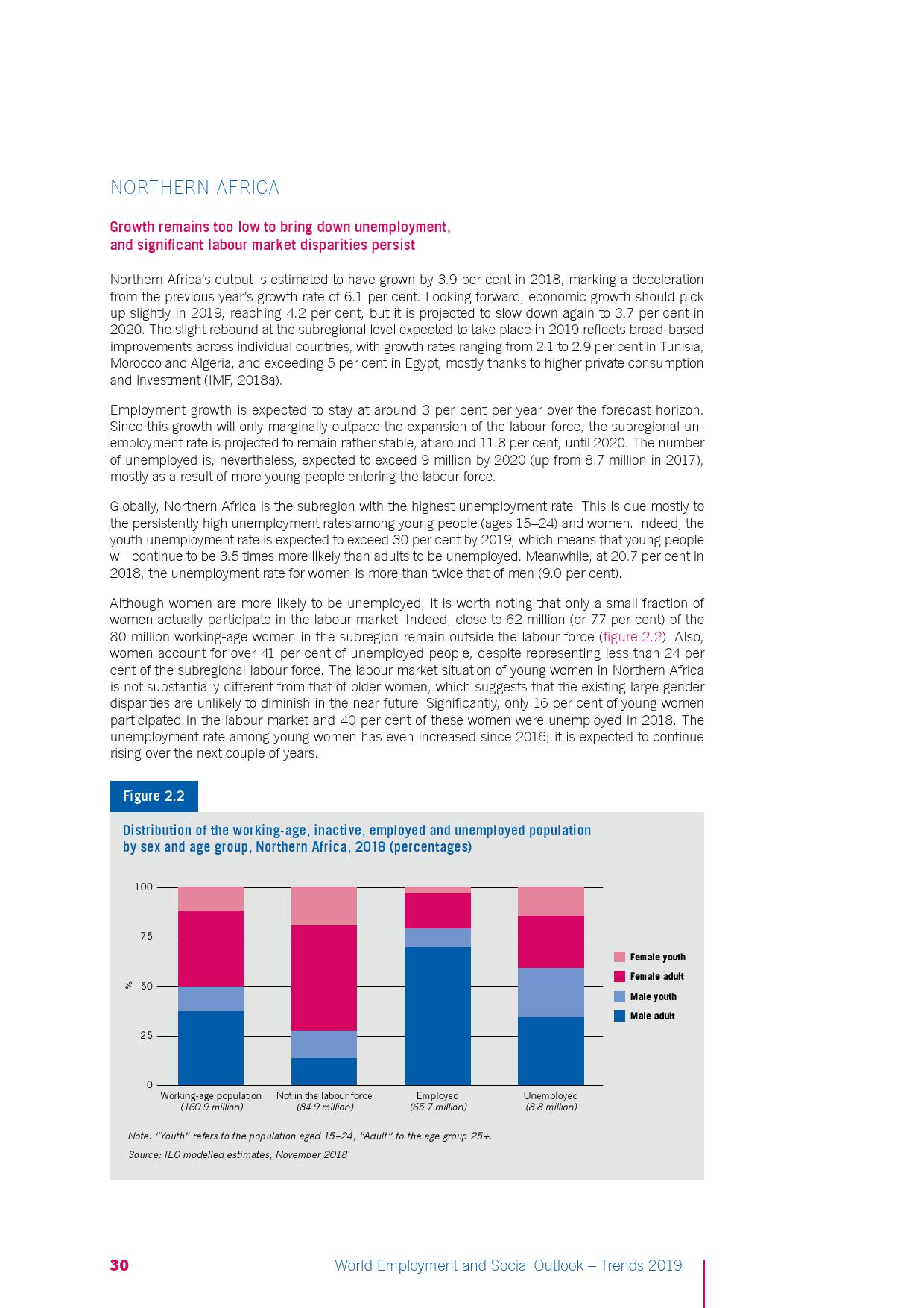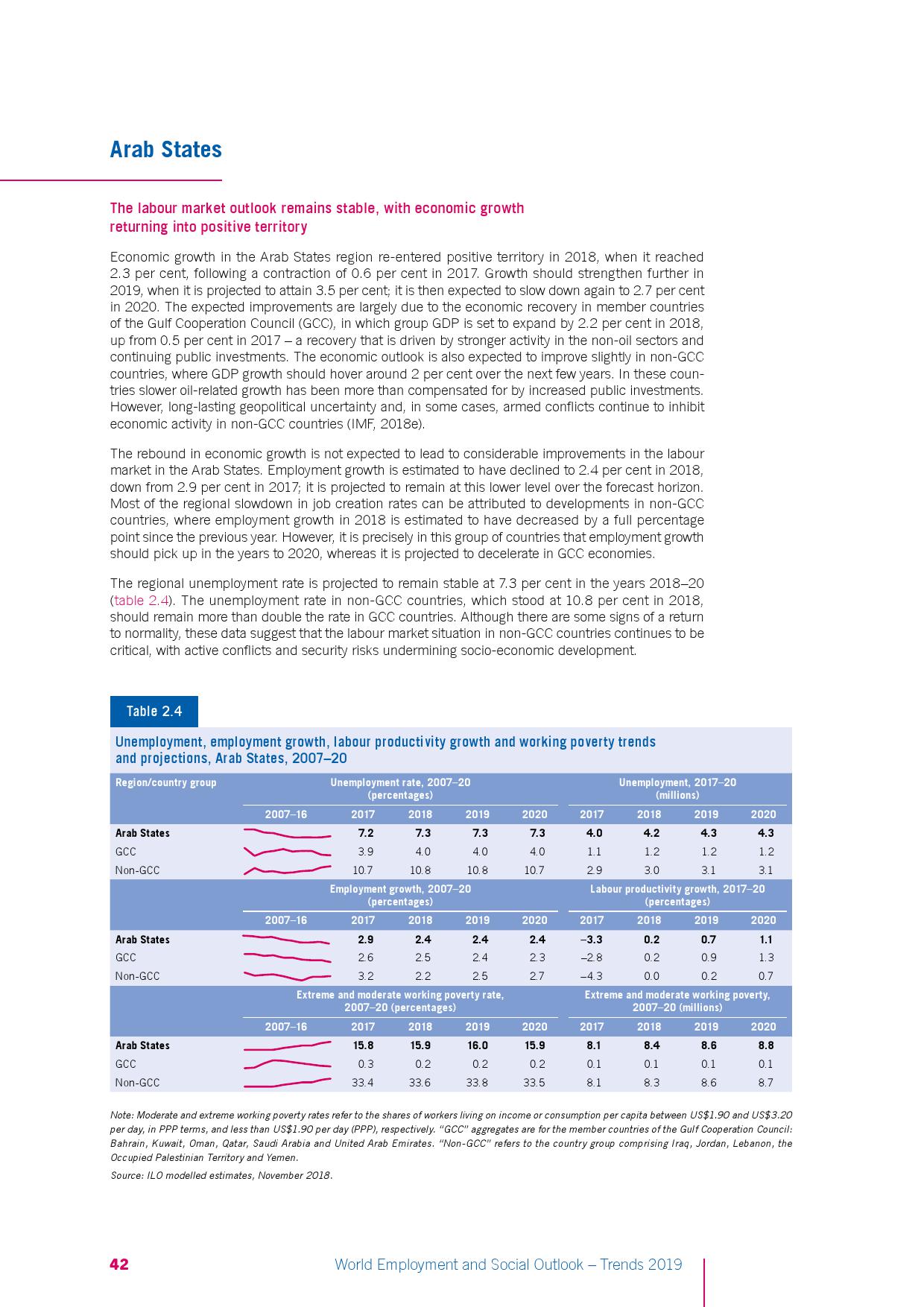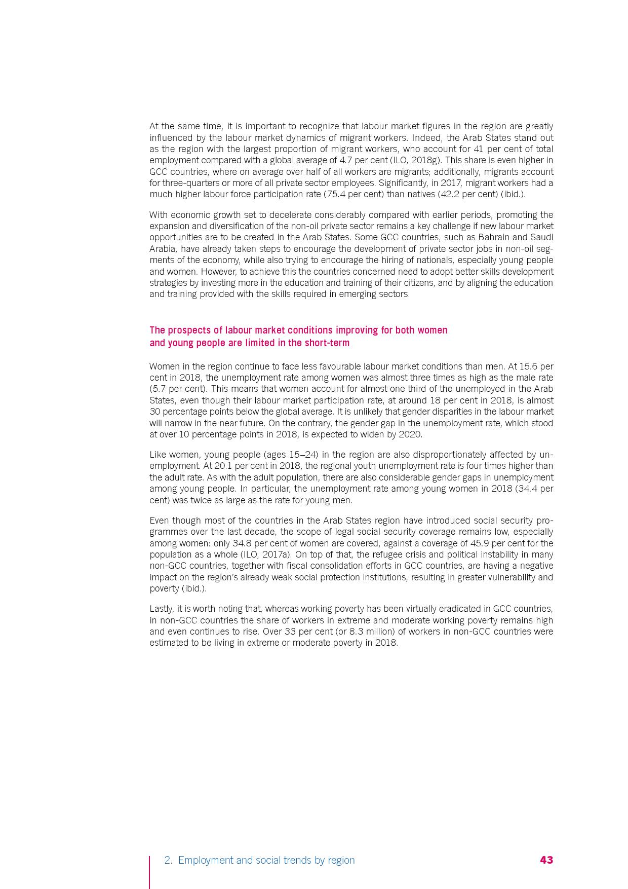 在阿拉伯国家,预计到2020年,该区域的失业率将维持在7.3%,移民工人占该区域总就业人口的41%,女性失业率为15.6%,是男性的三倍。青年人也受到不成比例的影响,青年人失业率是成年人的四倍。