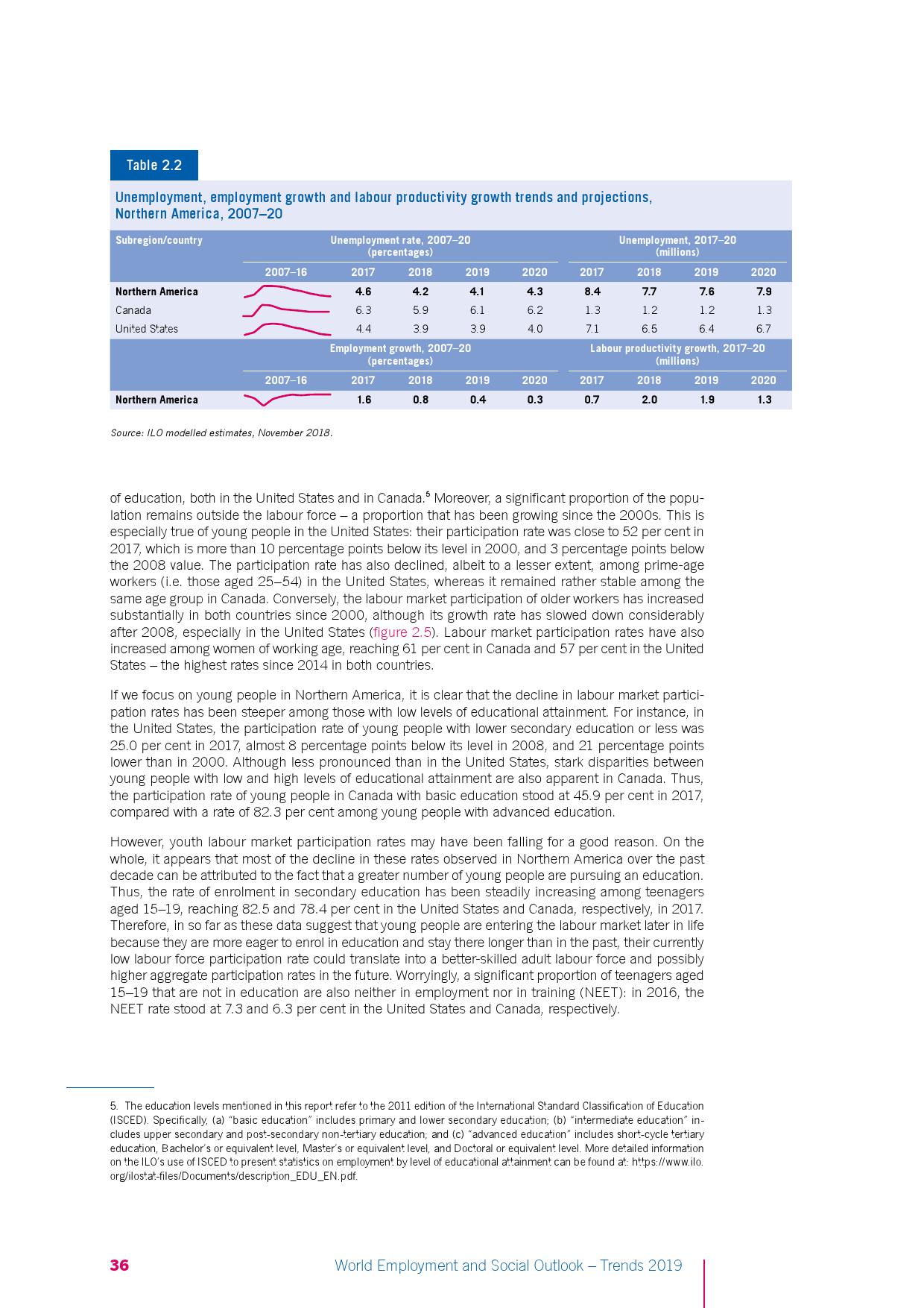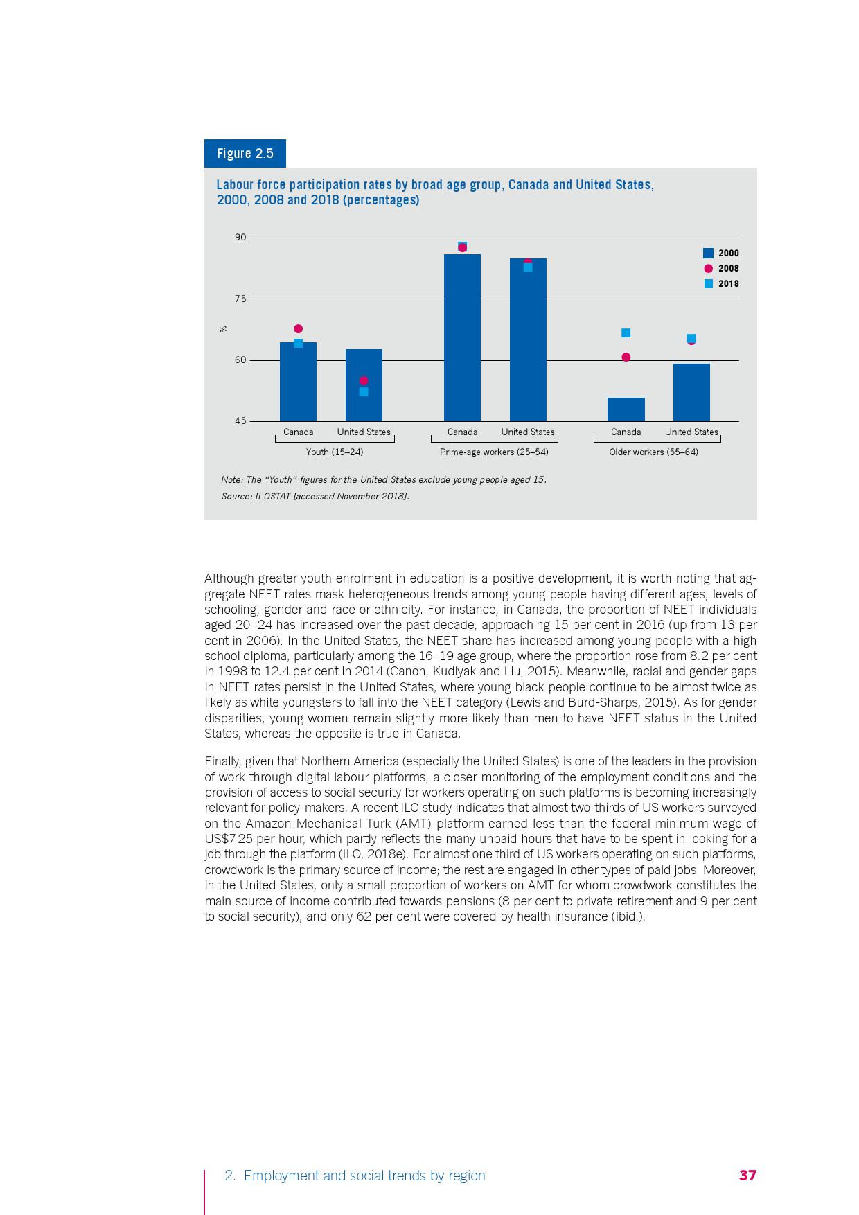在北美地区,预计失业率将在2019年降至历史最低水平,即4.1%。接受过基础教育的人失业的可能性是受过高等教育的人的两倍多。该区域是数字劳动力平台的领导者。因此,对政策制定者来说,密切监管此类工作是一个日益重要的问题。