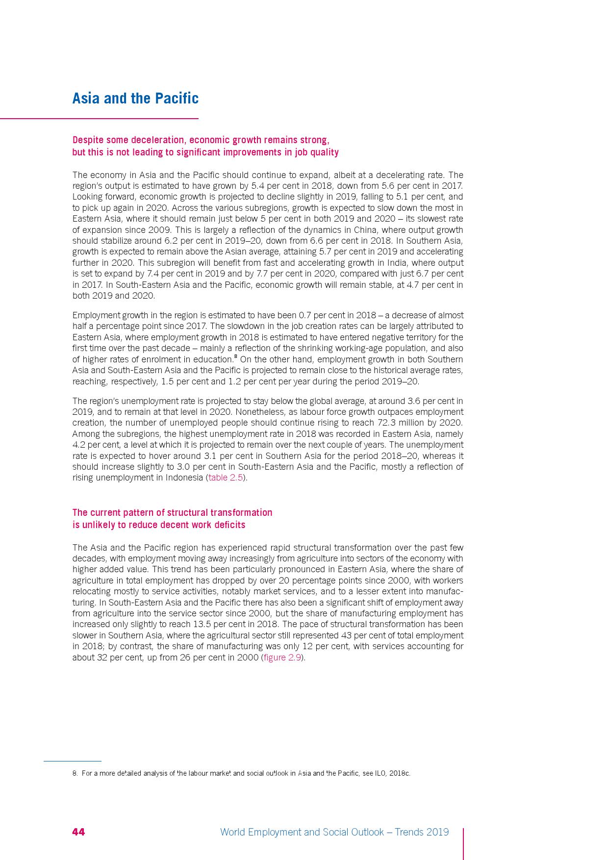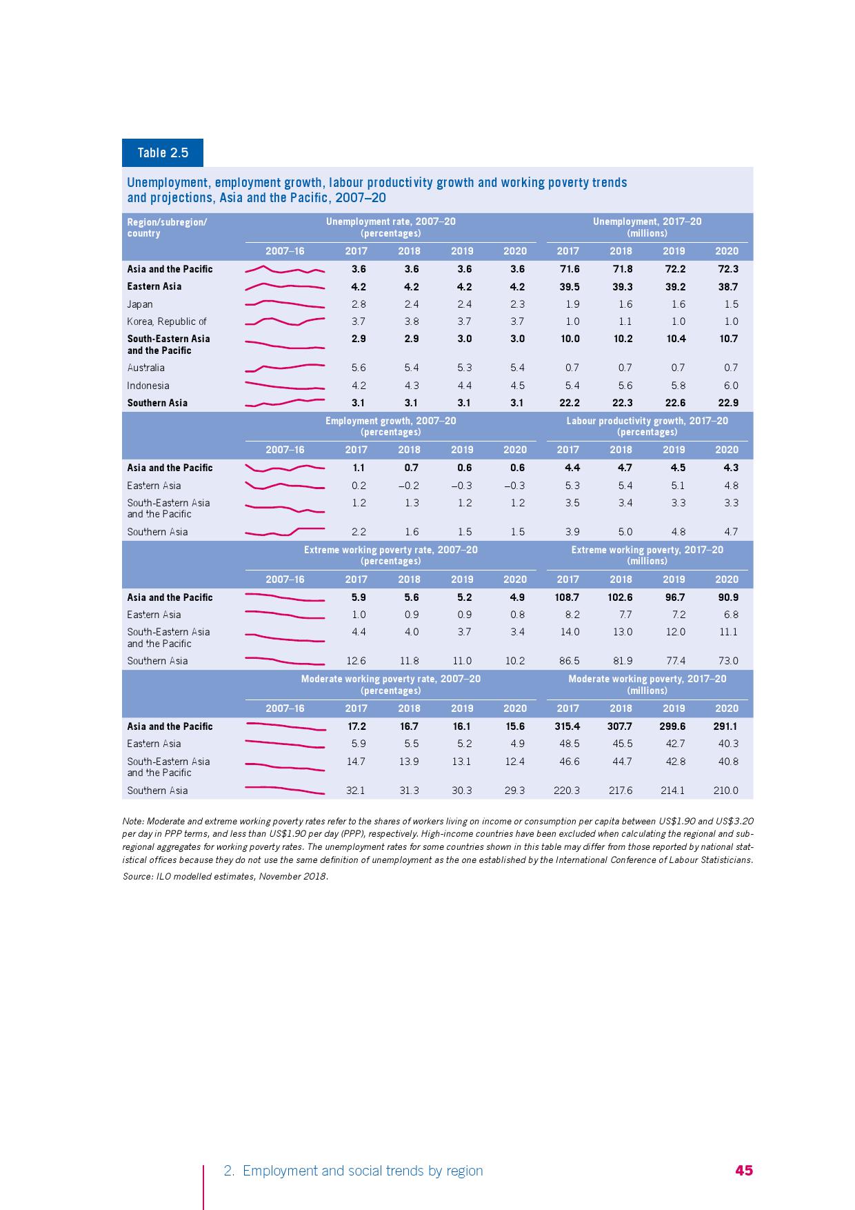 在亚太地区,预计到2020年,该区域失业率将维持在3.6%左右,低于全球平均水平。经济结构转型已经使劳动者摆脱了以农业为主的就业,但这并没有显著提高工作质量;很大一部分人缺乏工作保障、书面合同和稳定收入。