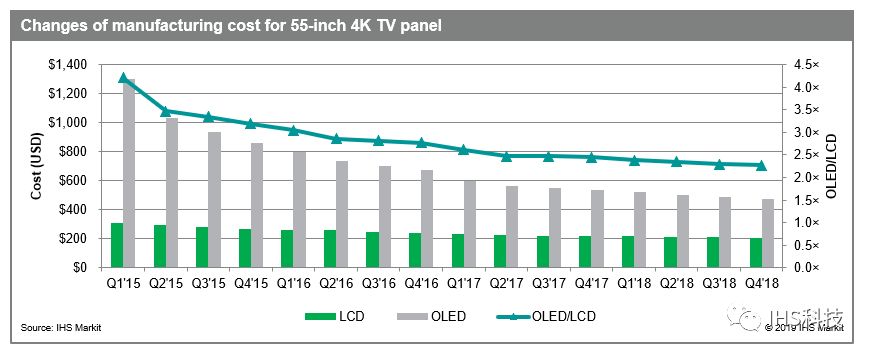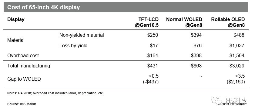制造成本必须是商业化考虑的基本因素之一。IHS Markit估计目前阶段65英寸4K可卷曲OLED面板的制造成本为3,029美元。它比同等尺寸和分辨率的传统TFT-LCD电视模组的成本高出近7倍。在开始时,该差距可能甚至比WOLED的制造成本更大。当2015年第一次推出4K WOLED TV时,其OLED面板制造成本仅为TFT LCD成本的4倍左右。